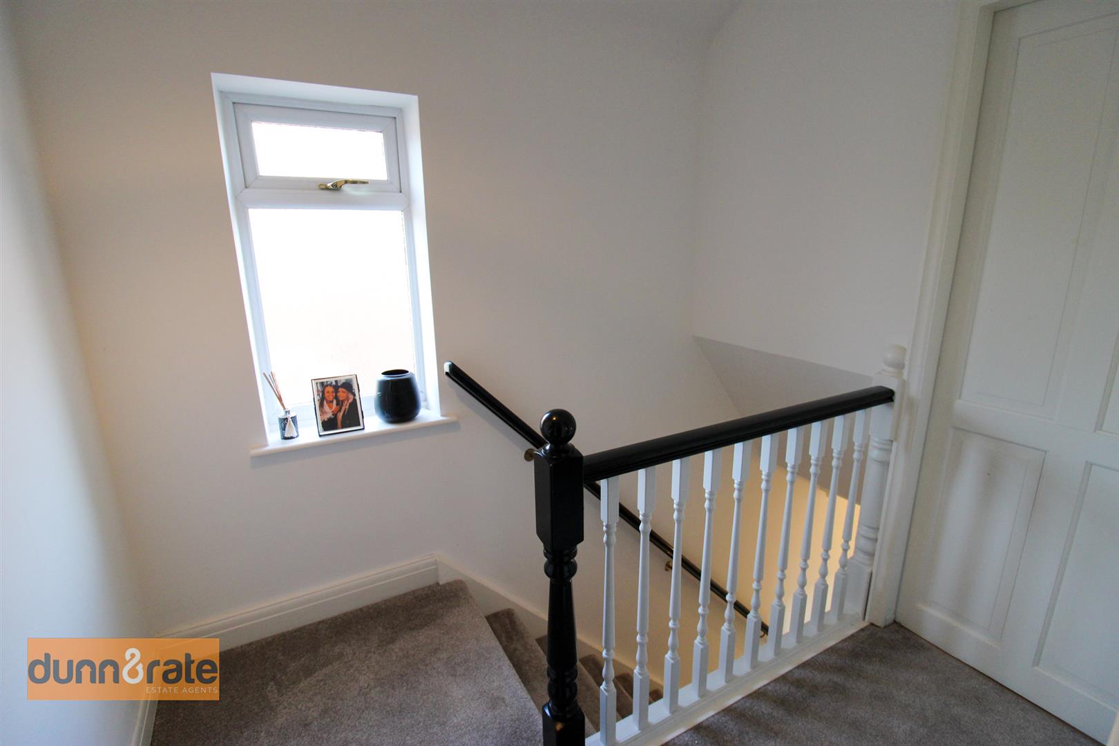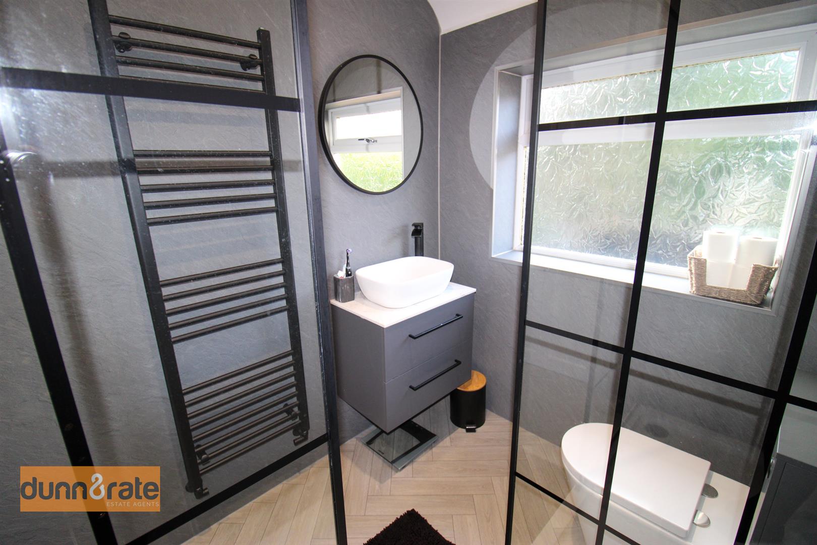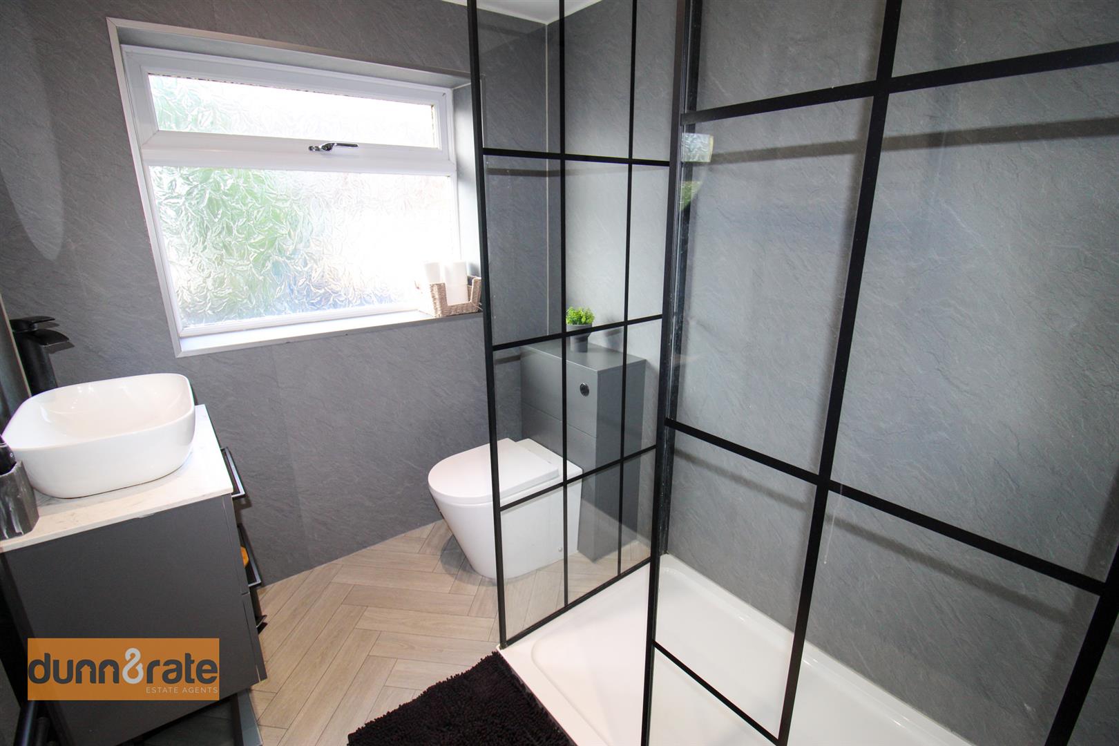 A double glazed window overlooks the rear aspect. Fitted with a suite comprising shower unit with waterfall shower, vanity hand wash basin and low level W.C. Vertical height radiator and ceiling spotlights.