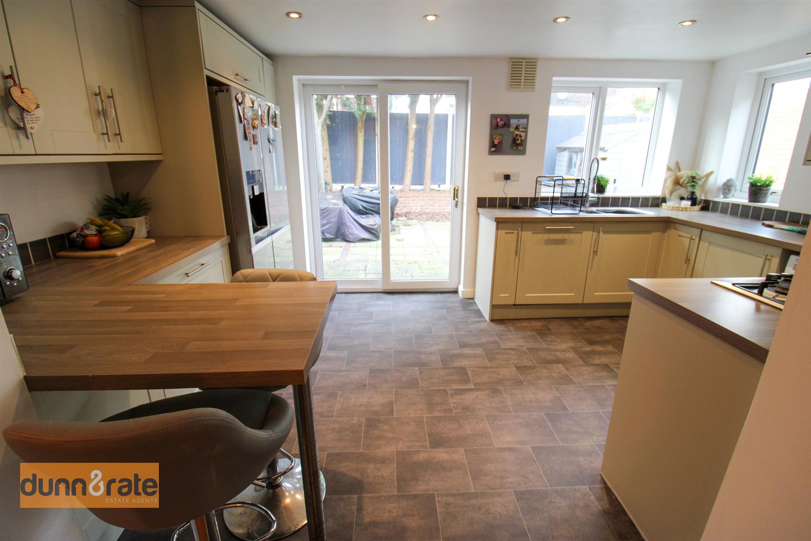 A double glazed window overlooks the side and rear aspect coupled with a sliding upvc door to the rear. Fitted with a range of wall and base storage units with inset stainless steel sink unit and side drainer. Coordinating work surface areas and partly tiled walls. Integrated electric oven, gas hob with cooker hood above, washing machine and dishwasher with space for fridge/freezer and tumble dryer. Ceiling spotlights.