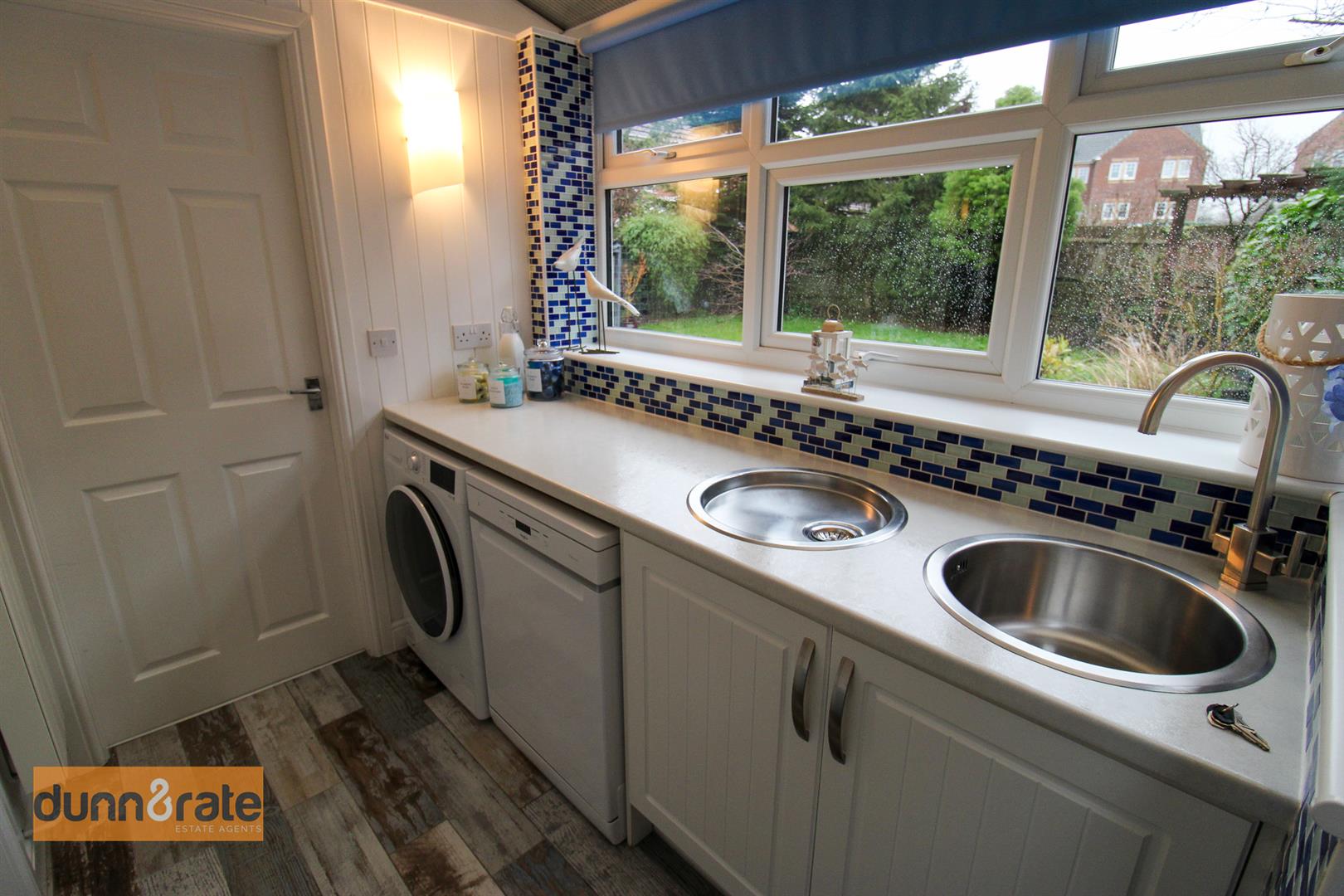 A UPVC window looks out to the rear aspect and a door opens to the side of the property. Fitted with base storage units. inset stainless steel sink and drainer, coordinating work surface areas and partly tiled walls. Flat panel radiator, space and plumbing for a washing machine and dishwasher.
