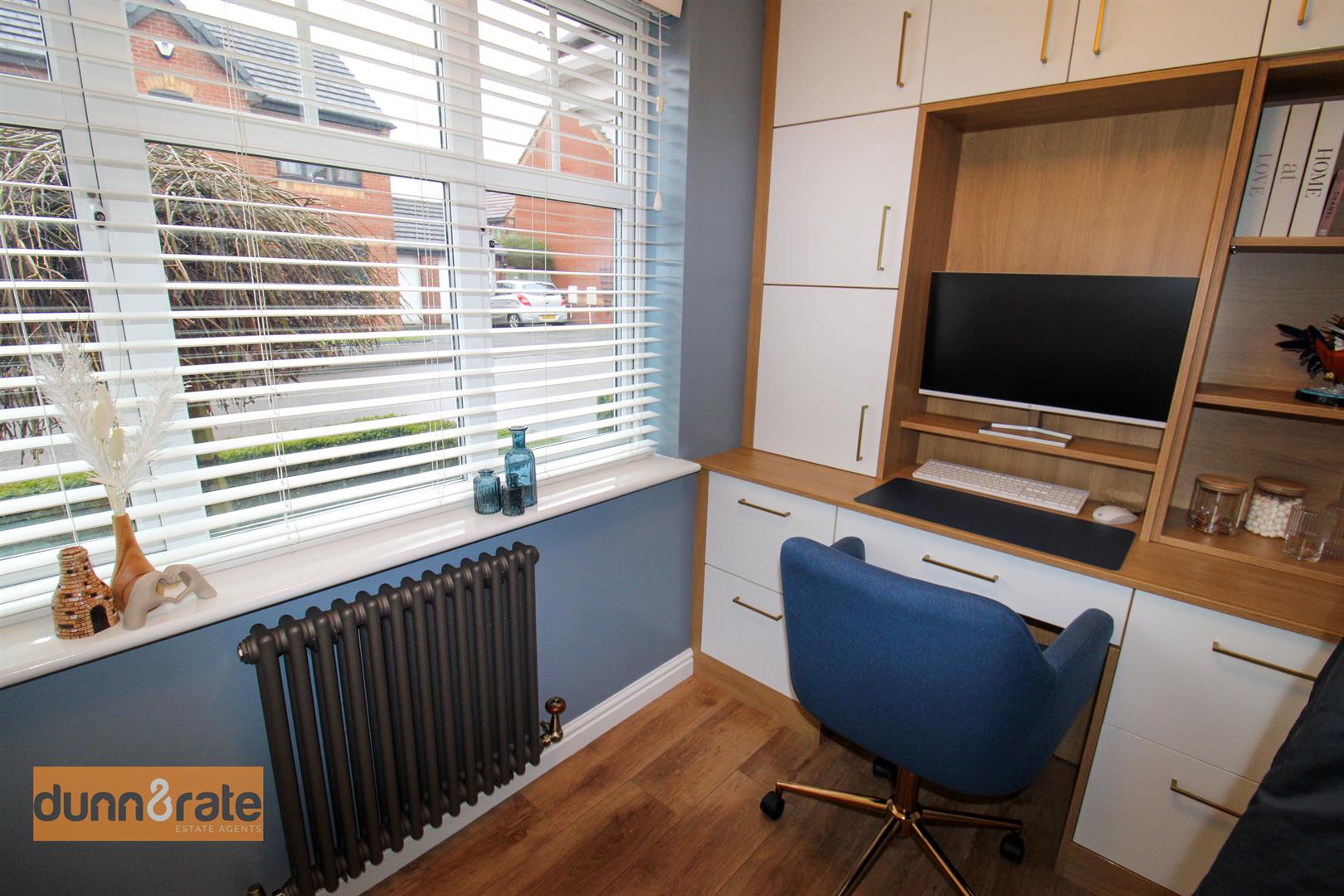 A UPVC window looks out to the front aspect. Fitted with a desk and storage cupboards and column radiator.