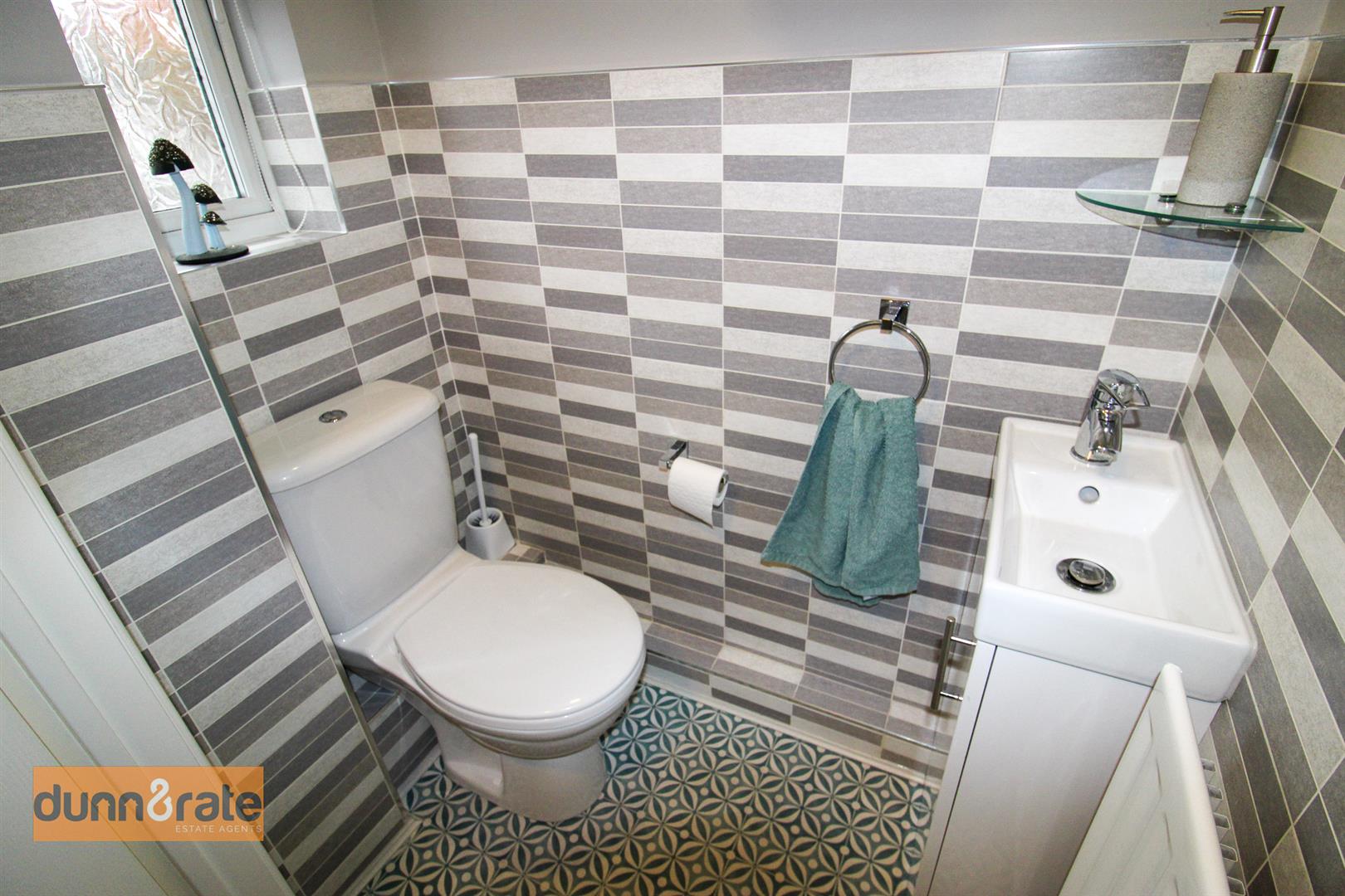 A UPVC window looks out to the front aspect. Fitted with a Low Level WC and wash hand basin with vanity unit. Tiled walls and radiator.