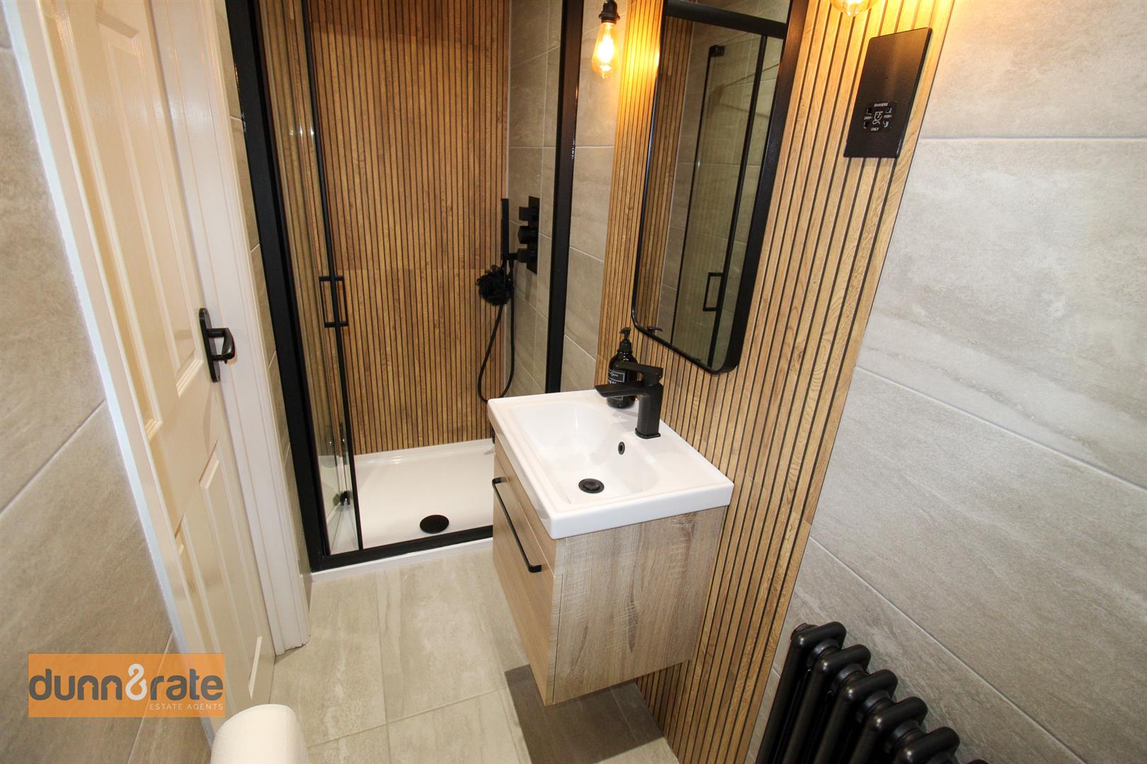 A UPVC window looks out to the side aspect. Fitted with a shower cubicle, Low Level WC and wash hand basin with drawer vanity. Column radiator, extractor fan, shaver point and fully tiled walls.