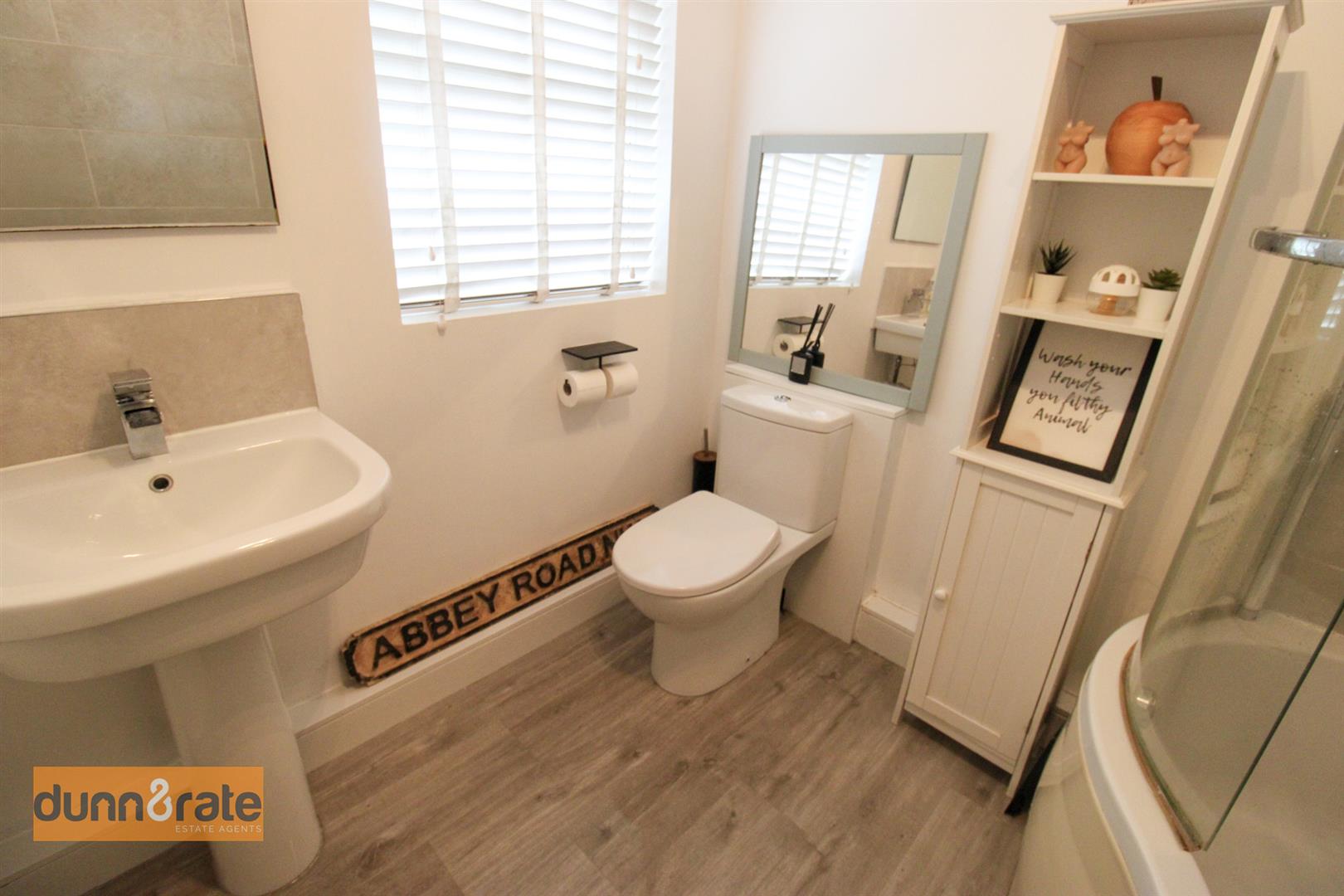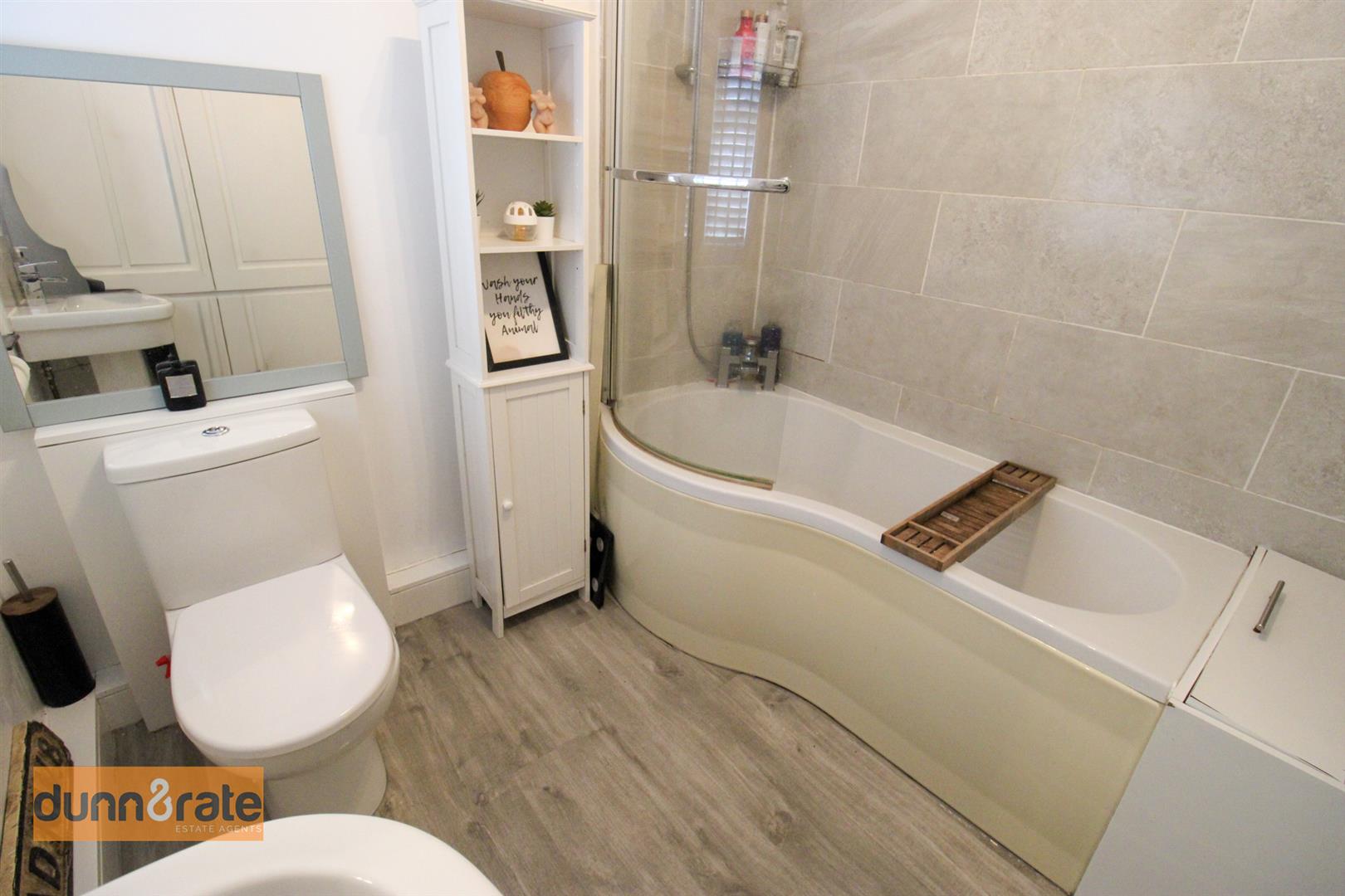 A double glazed window overlooks the side aspect. Fitted with a suite comprising p-shaped bath with shower over, low level W.C and wash hand basin. Fully tiled walls and extractor fan. Ladder style towel radiator.