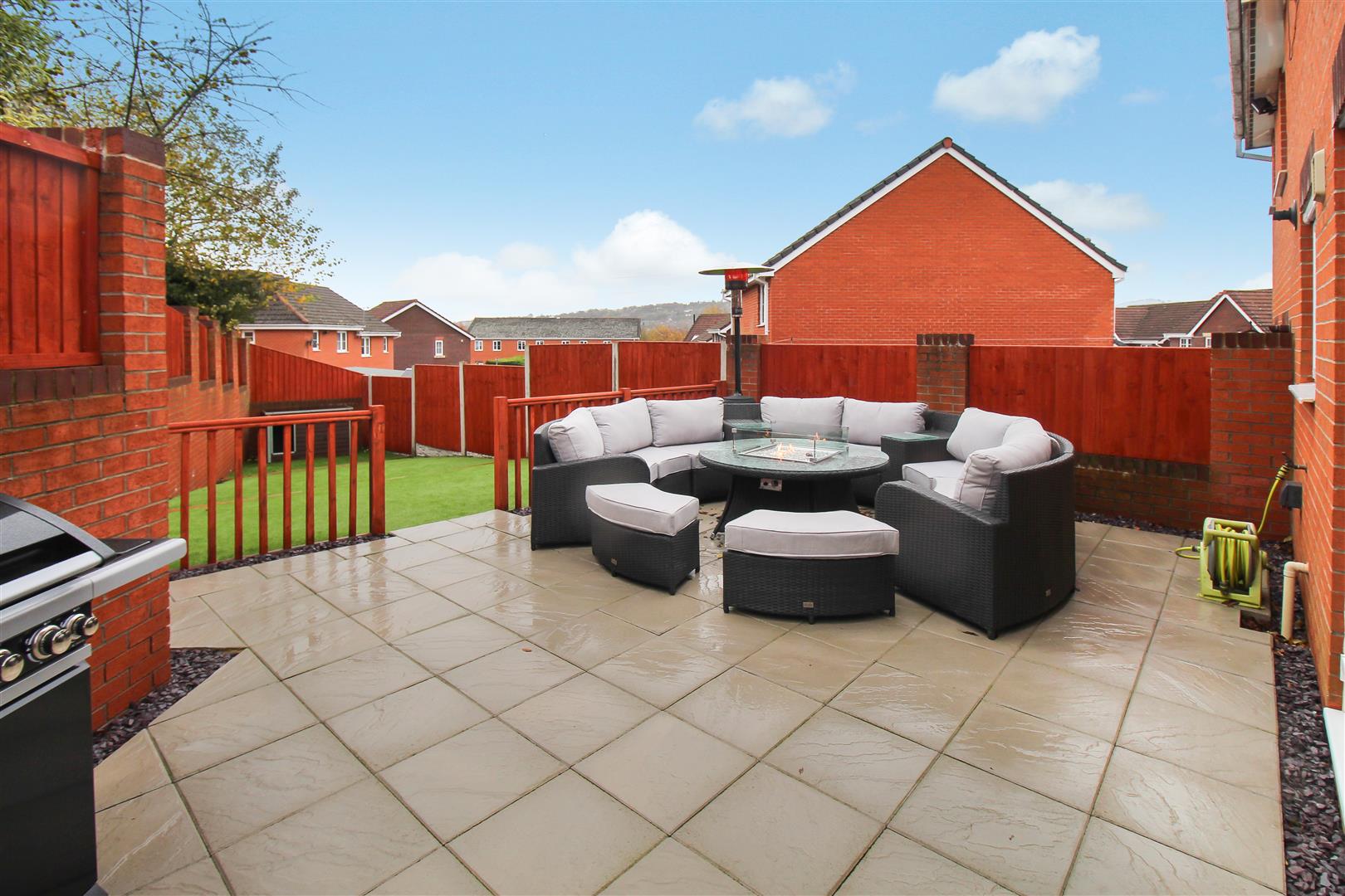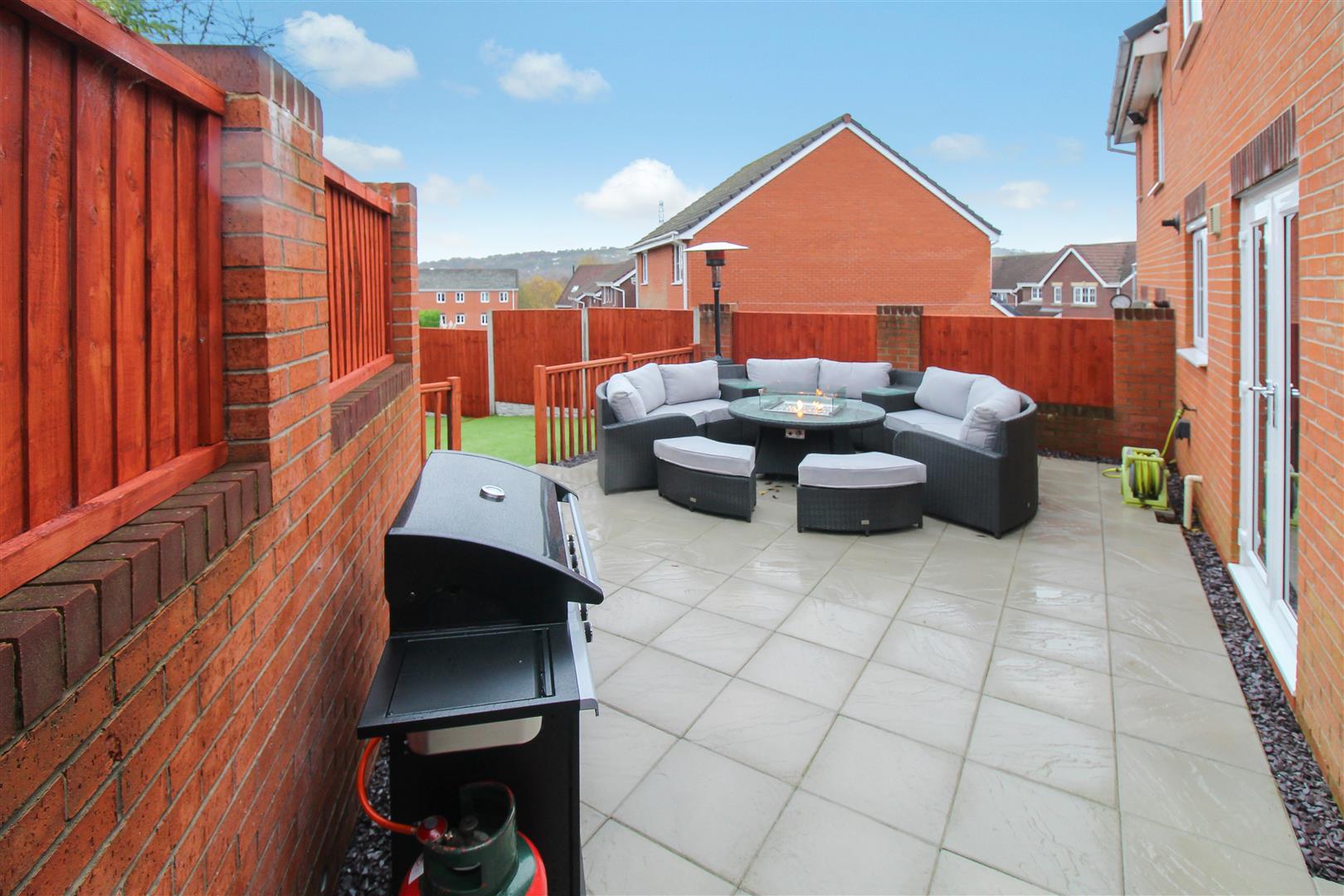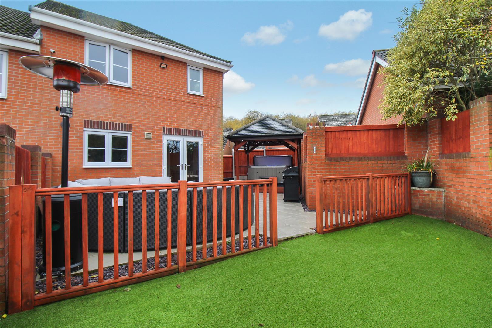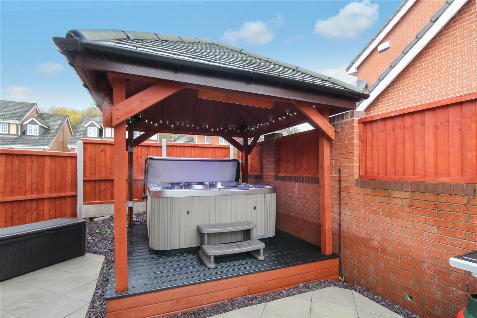 To the front the property is landscaped with artificial lawn and sleeper borders. Paved pathways lead to the entrance door and the tarmacadam driveway which leads down the side of the property. To the rear the property is laid with artificial lawn with a large paved patio seating area. Wooden gazebo with power and lighting, television point and surround sound system. Plumbing and space for hot tub.