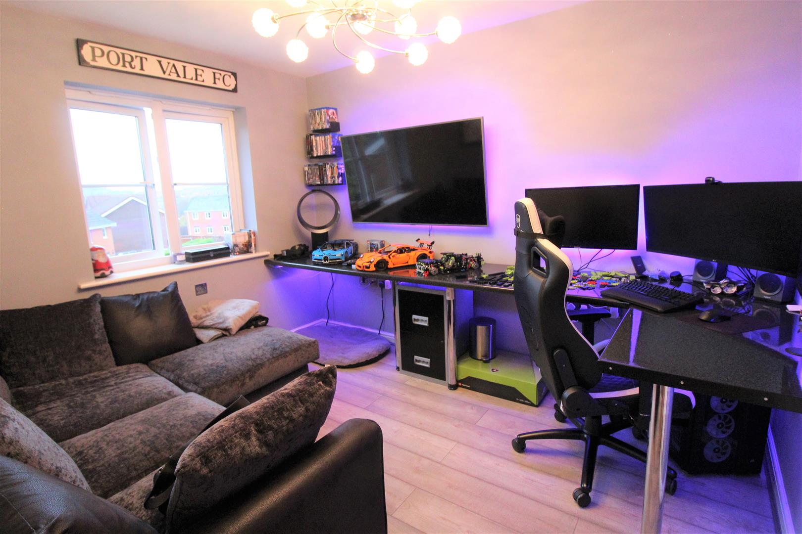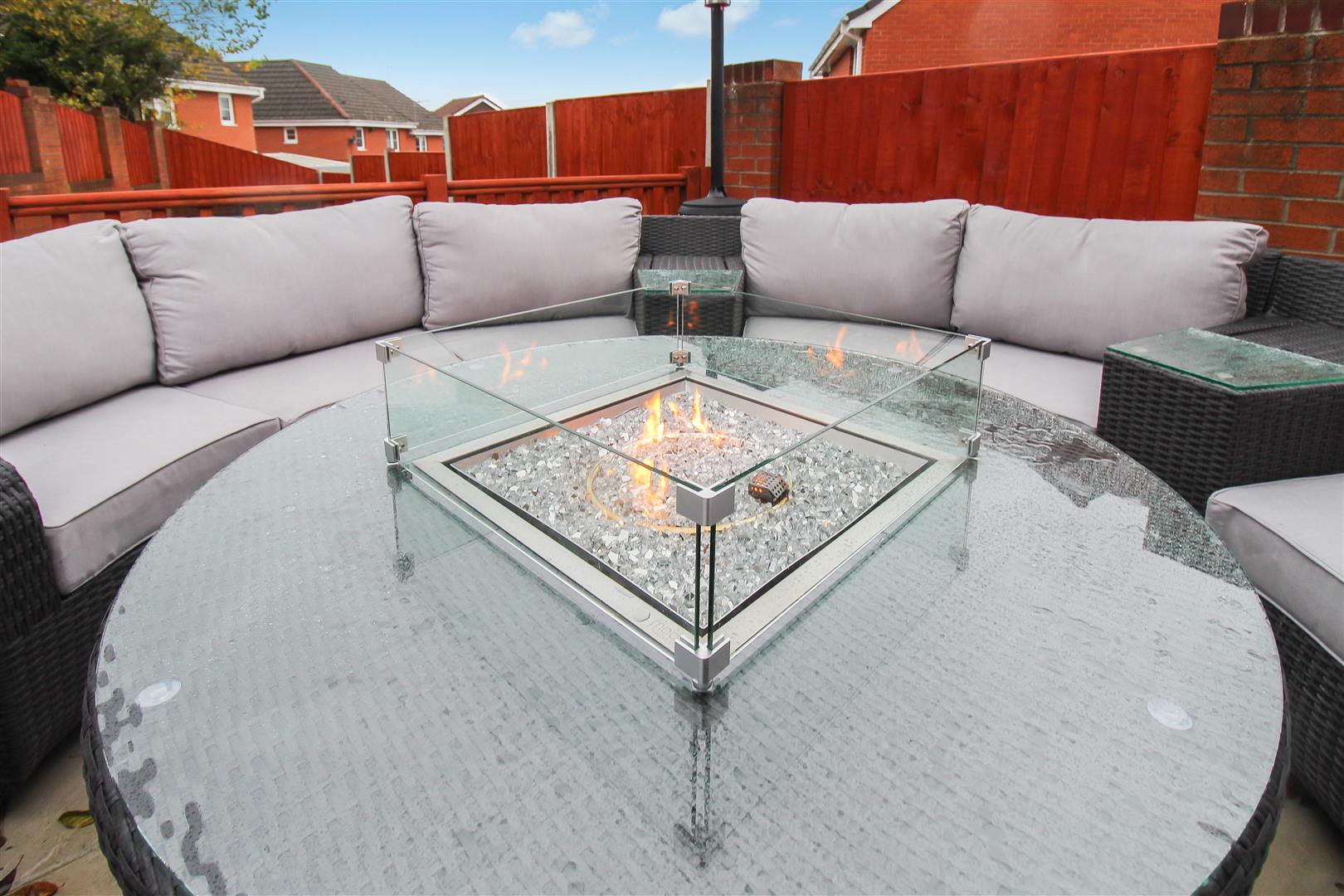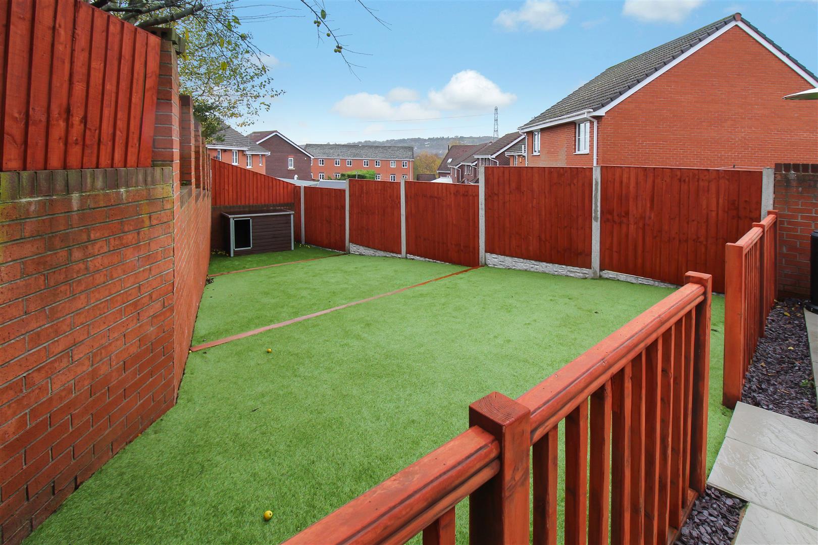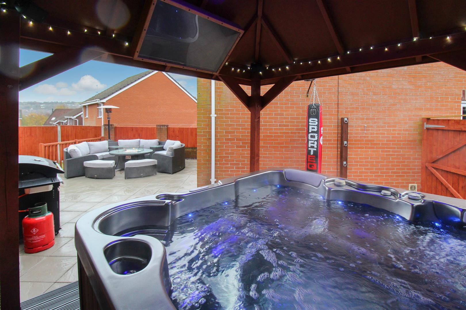 To the front the property is landscaped with artificial lawn and sleeper borders. Paved pathways lead to the entrance door and the tarmacadam driveway which leads down the side of the property. To the rear the property is laid with artificial lawn with a large paved patio seating area. Wooden gazebo with power and lighting, television point and surround sound system. Plumbing and space for hot tub.