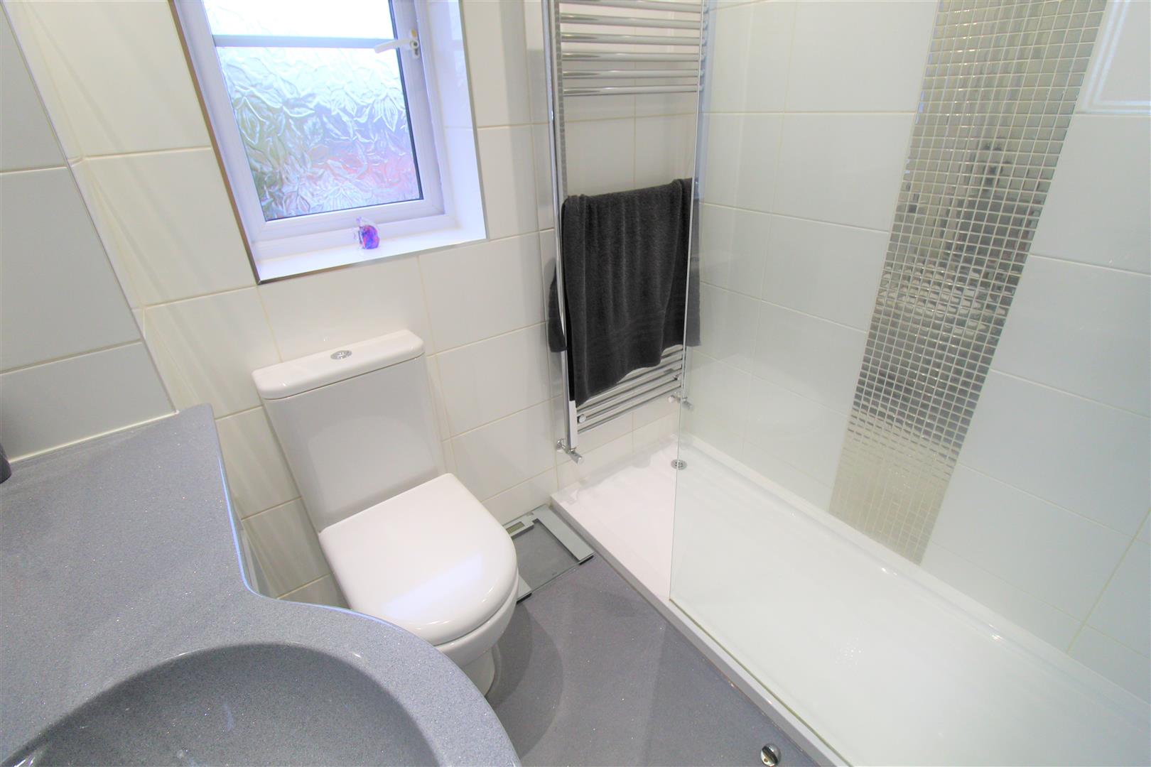 A double glazed window overlooks the rear aspect. Fitted with a double shower unit with waterfall shower head, low level W.C and vanity hand wash basin. Fully tiled walls, extractor fan. Ladder style towel radiator. Ceiling spotlights.