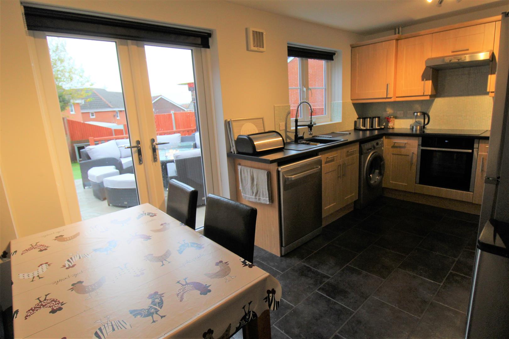 A double glazed window overlooks the rear aspect coupled with double glazed patio doors. Fitted with a range of wall and base storage units with inset asterite sink unit and side drainer. Coordinating work surface areas and partly tiled walls. Integrated electric oven and hob over with cookerhood above. Space and plumbing for fridge/freezer, washing machine and dishwasher. Under stairs storage cupboard. Space for table and chairs and radiator. Wall mounted central heating boiler.