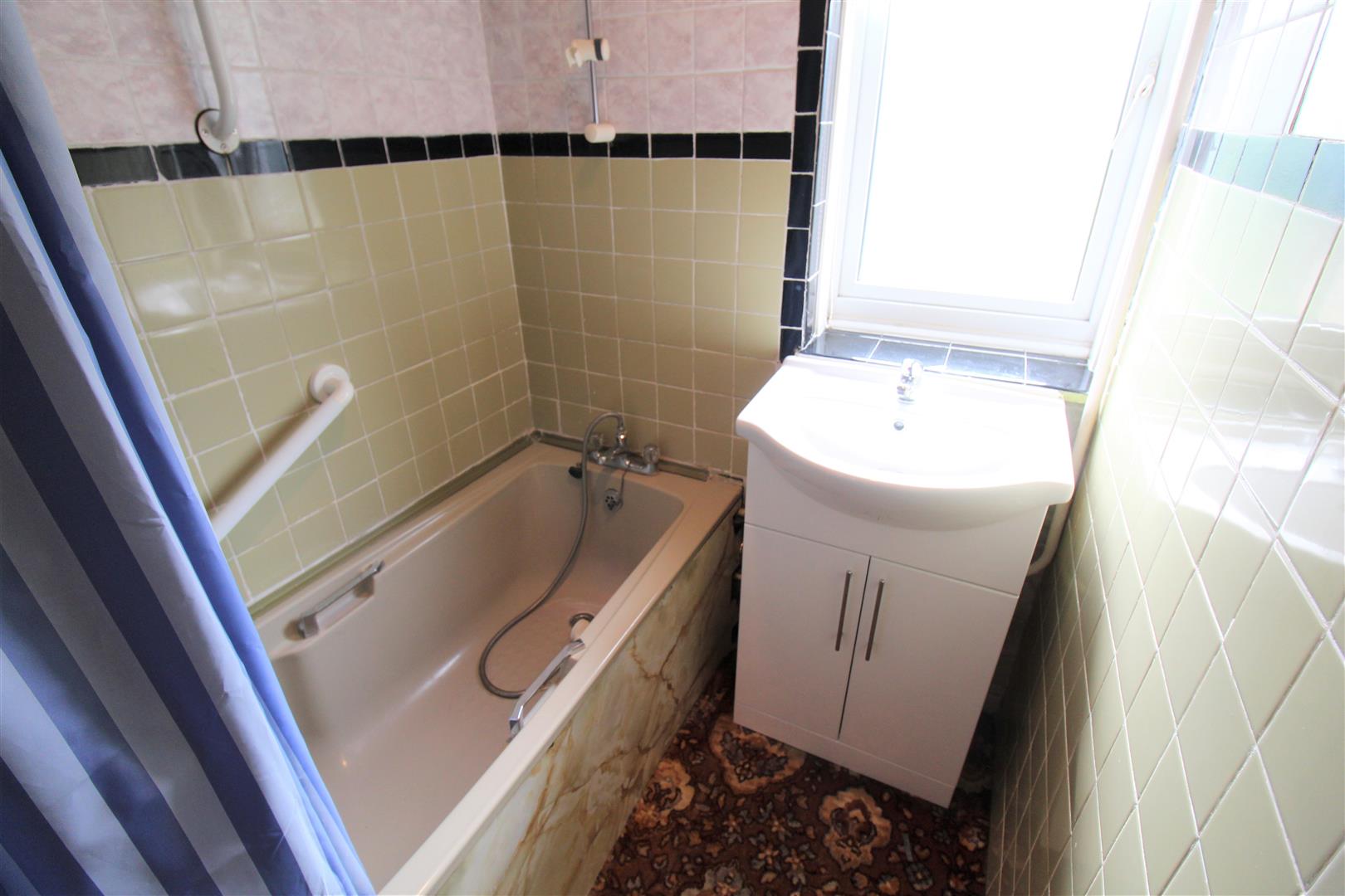 A double glazed window overlooks the rear aspect. Fitted with a suite comprising bath with shower over and vanity hand wash basin. Fully tiled walls.