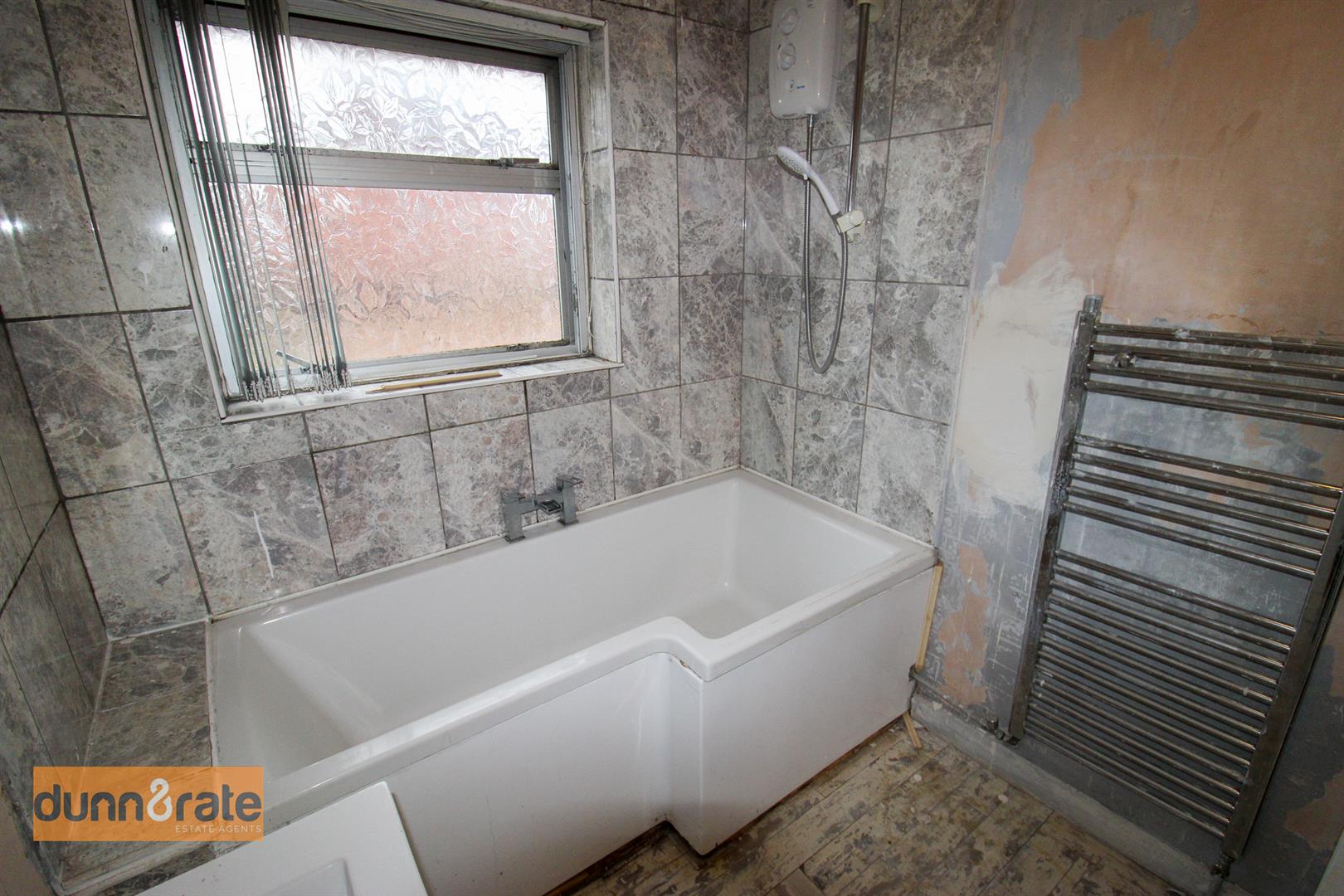 Window to the rear aspect. Fitted with a suite comprising p shaped bath with shower above, low level WC and wash hand basin. Partly tiled walls and vertical radiator, Loft hatch access.