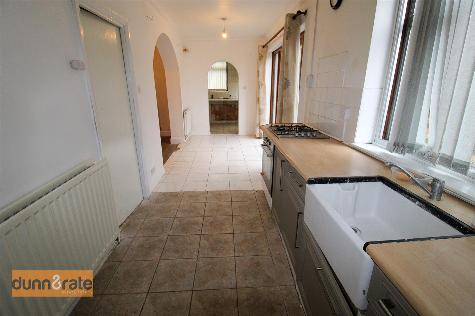 UPVC patio doors to the rear aspect. Window to the rear aspect. Fitted with a range of wall and base storage units with inset ceramic sink. Coordinating work surface areas with partly tiled walls. Integrated appliances include gas hob and electric oven. Space for a fridge/freezer. Two radiators and tiled flooring.