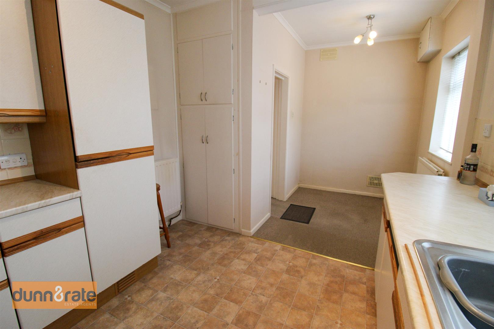 Two double glazed windows overlook the rear aspect. Fitted with a range of wall and base storage units with inset stainless steel sink unit and side drainer. Coordinating work surface areas and partly tiled walls. Integrated tumble dryer and space and plumbing for washing machine and fridge/freezer. Freestanding electric cooker. Storage cupboard. Two radiators. Space for table and chairs.