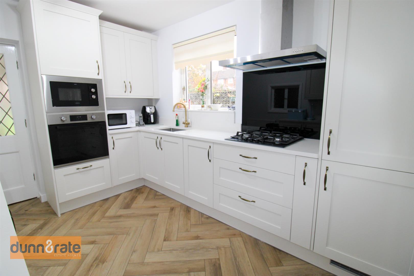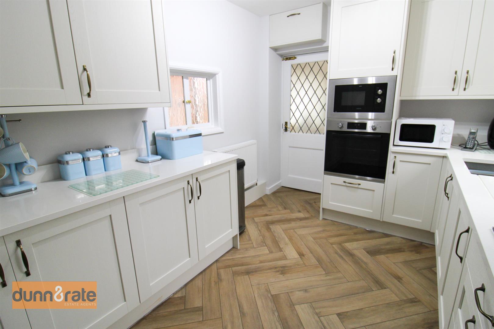 A double glazed window overlooks the side aspect. Fitted with a range of wall and base storage units with inset stainless steel sink unit and side drainer. Coordinating work surface areas with integrated appliances including fridge/freezer, microwave, electric oven and gas hob. Radiator.