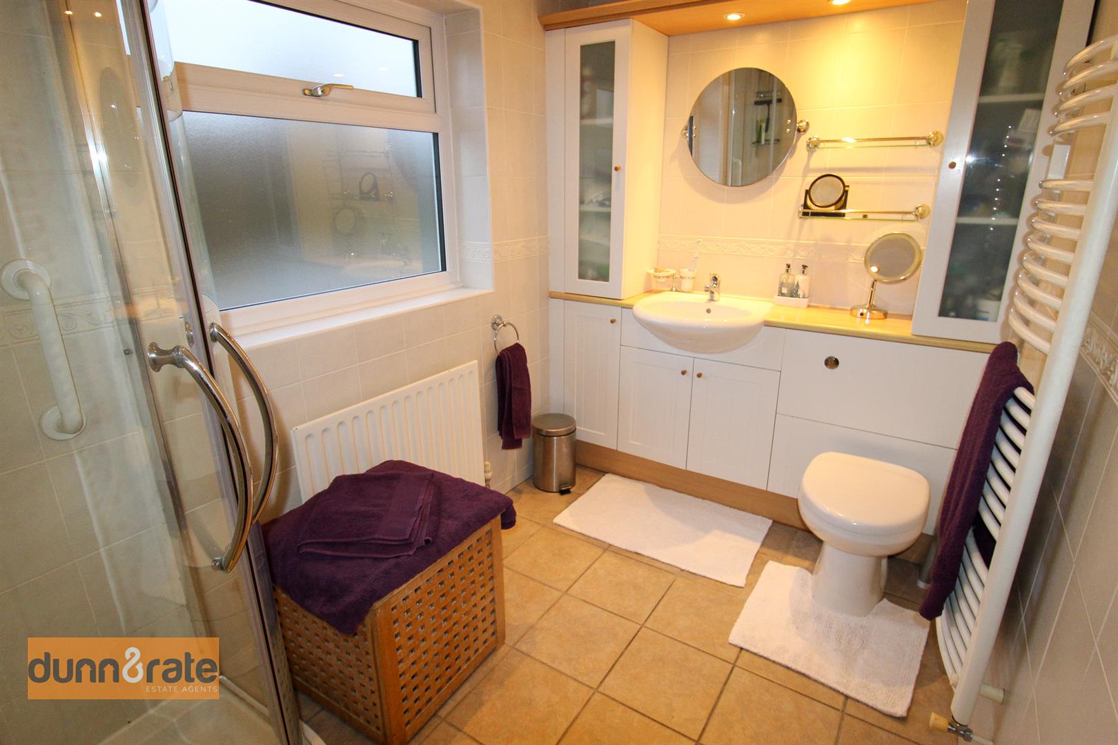 A double glazed window overlooks the front aspect. Fitted with a suite comprising shower unit, low level W.C and vanity hand wash basin. Fully tiled walls and flooring. Extractor fan and ceiling spotlights. Ladder style towel radiator.