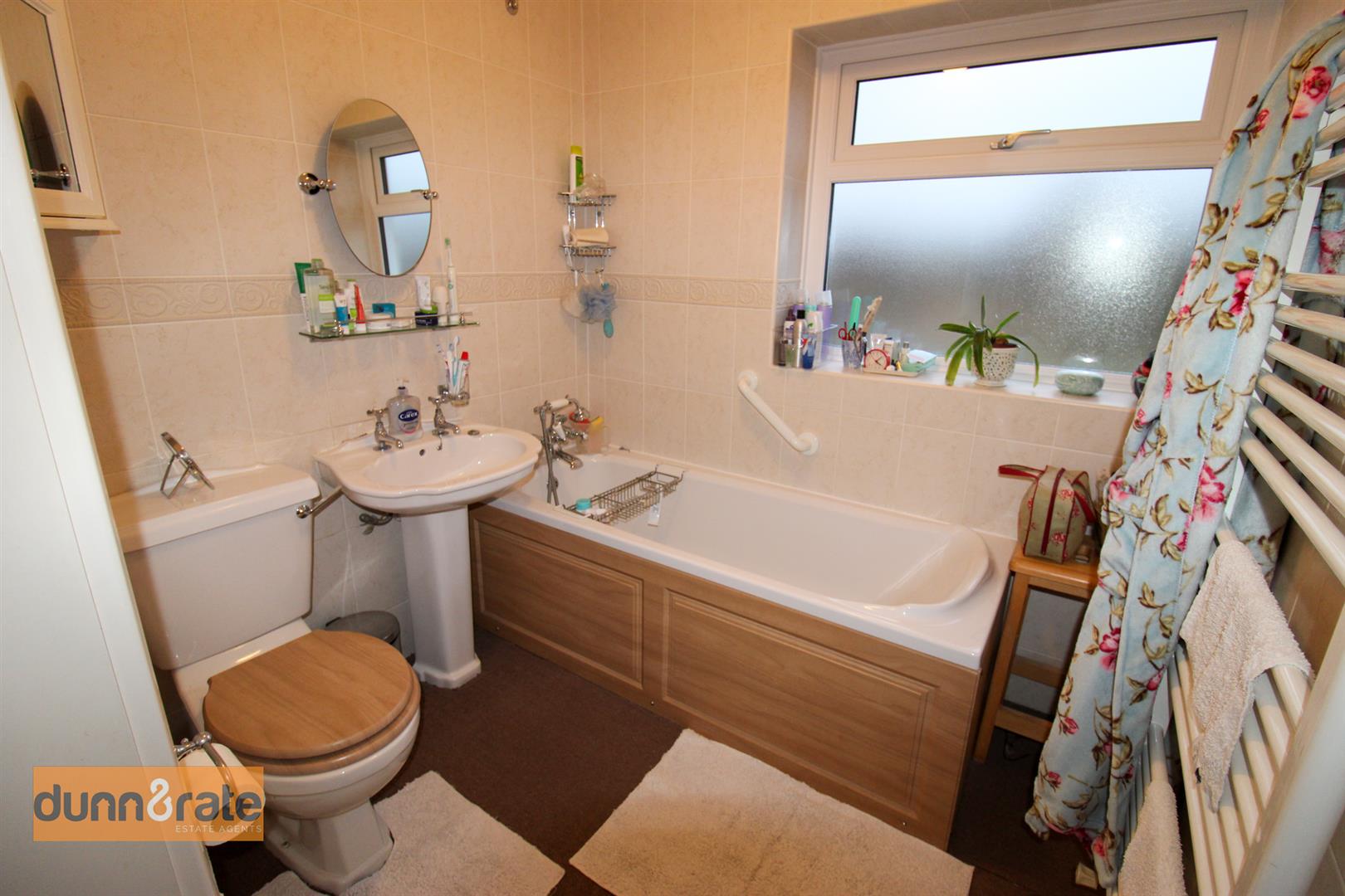 A double glazed window overlooks the front aspect. Fitted with a suite comprising bath with shower mixer tap, low level W.C and wash hand basin. Fully tiled walls and ladder style towel radiator. Airing cupboard.