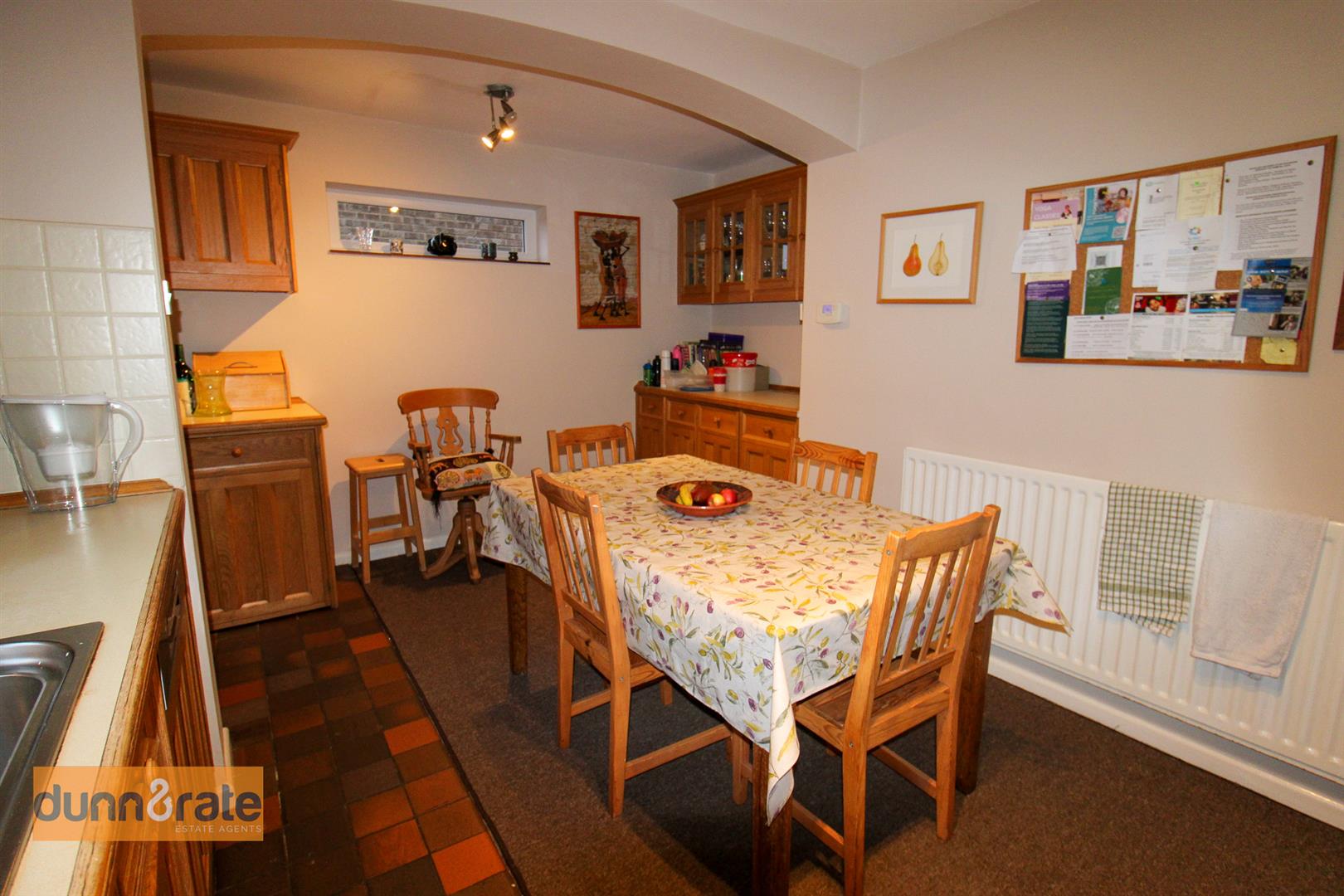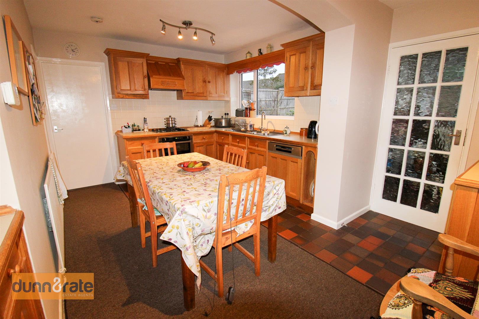 A double glazed window overlooks the side and rear aspect. Fitted with a range of wall and base storage units with inset stainless steel sink unit and side drainer. Coordinating work surface areas and partly tiled walls. Integrated electric oven, gas hob with cooker hood and dishwasher. Space for fridge and floor mounted central heating boiler. Space for table and chairs with partly tiled flooring. An access door leads into the garage. Radiator.
