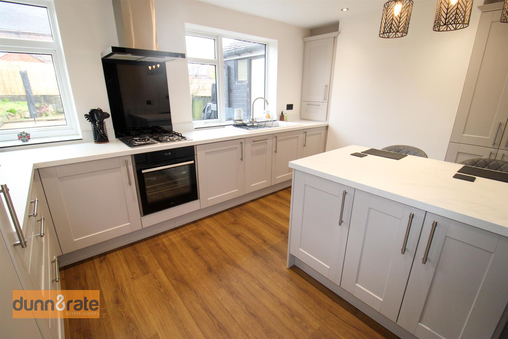 UPVC windows to the rear aspect, UPVC door to the side aspect. Fitted with a range of wall and base storage units with inset ceramic sink and side drainer. Co ordinating work surface areas. Integrated appliances include electric oven and gas hob with cooker hood above, washing machine, dishwasher and fridge/freezer. Vertical radiator and ceiling spots. LVT flooring.