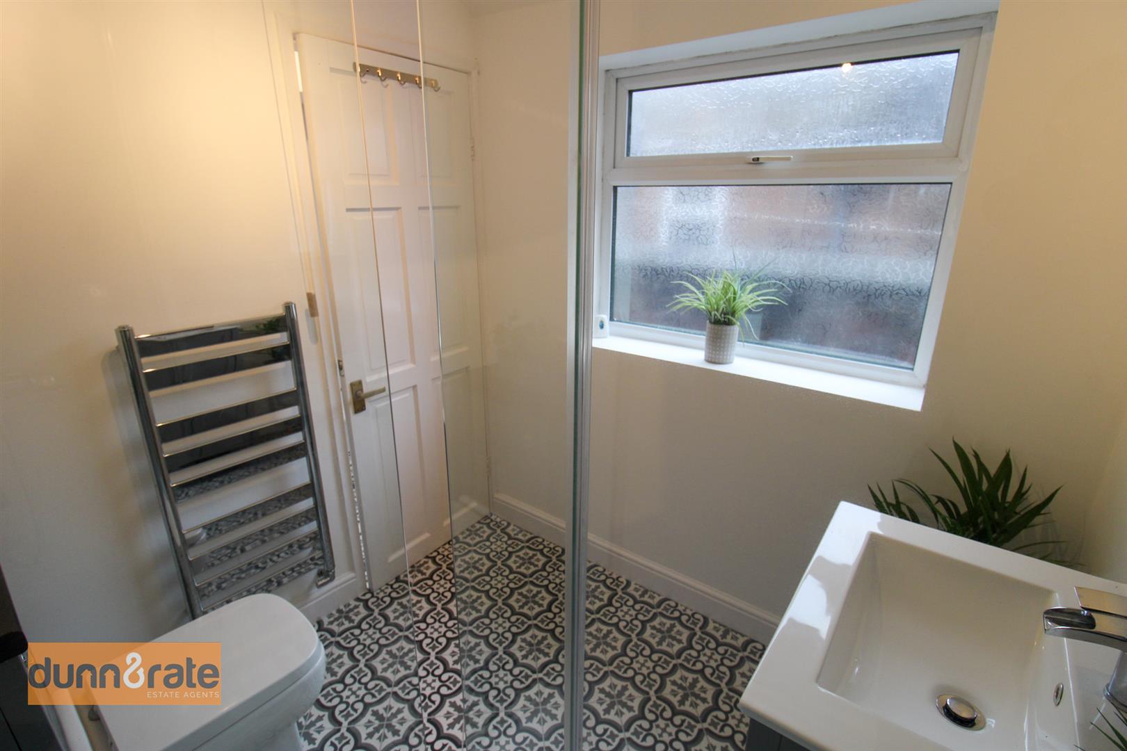 UPVC window to the side aspect. Fitted with a suite comprising double shower cubicle with waterfall shower above. Vanity wash hand basin and low level W/C. Partly tiled walls and vertical towel rail.