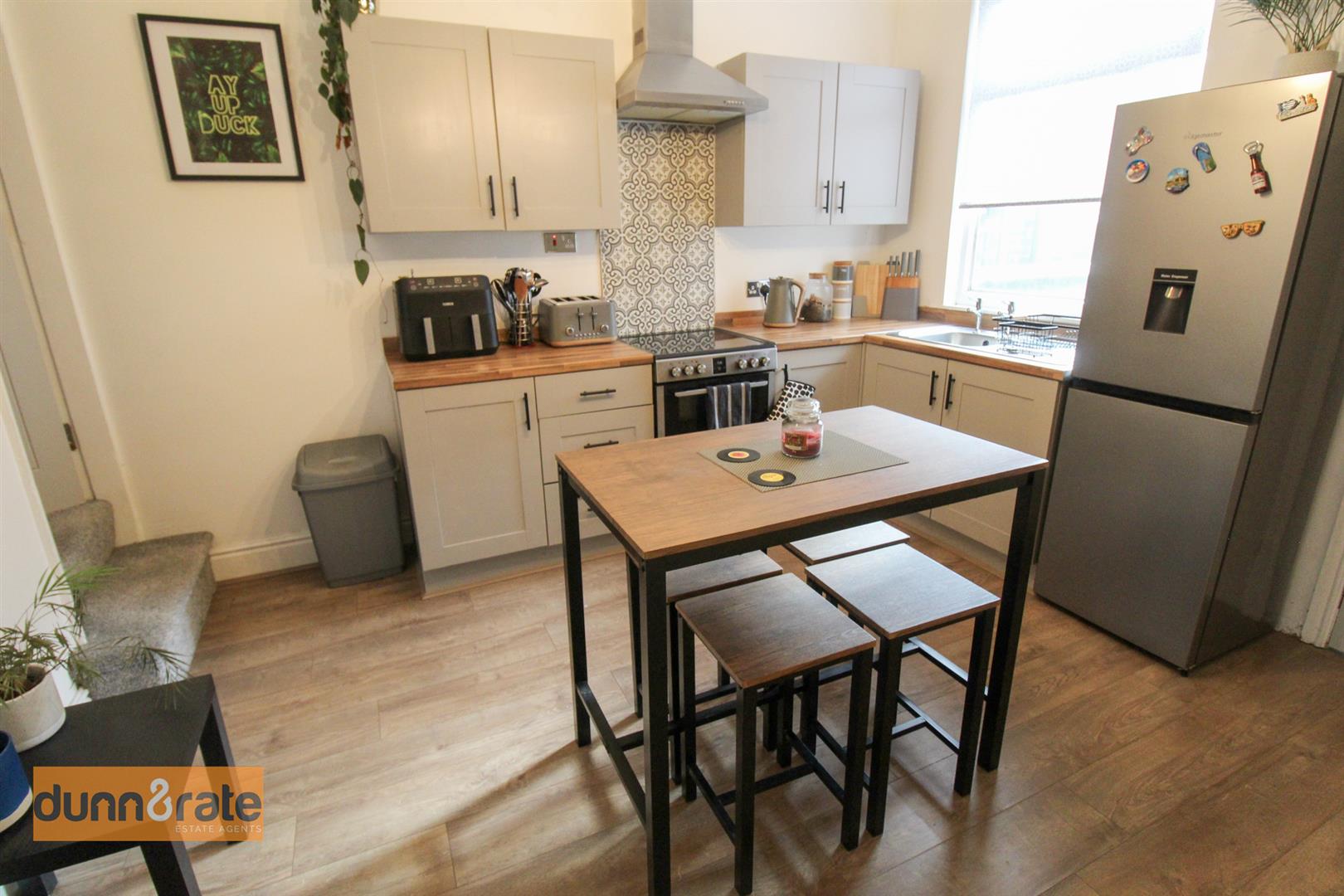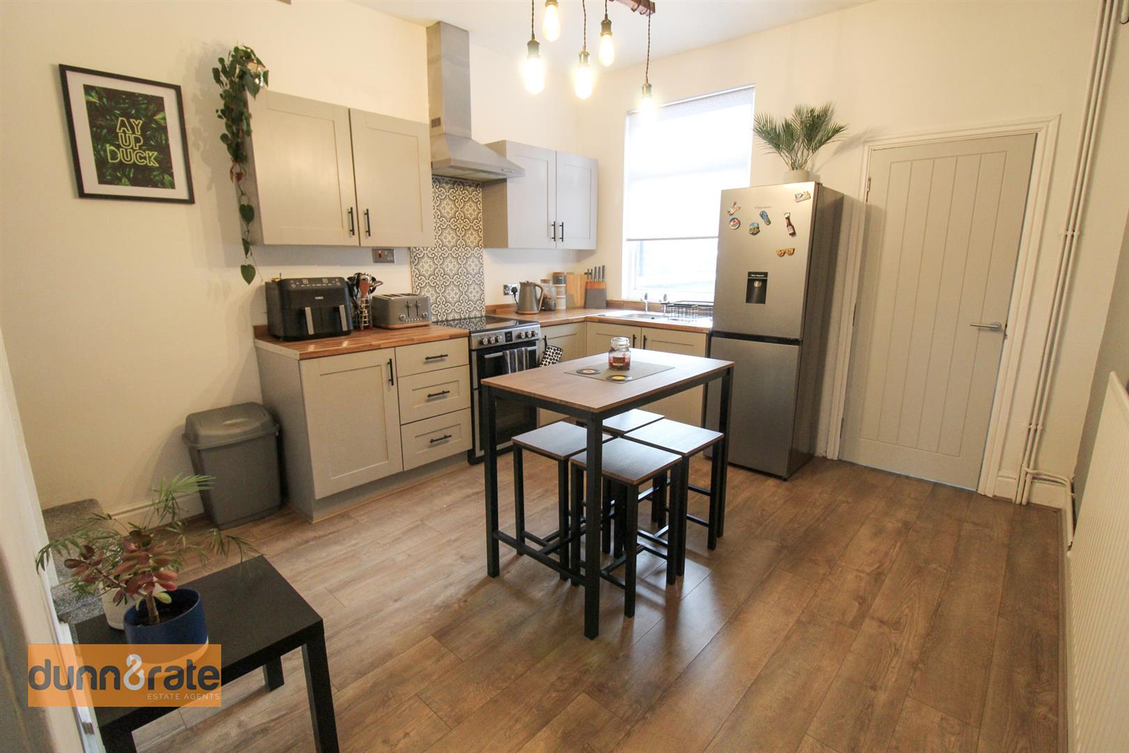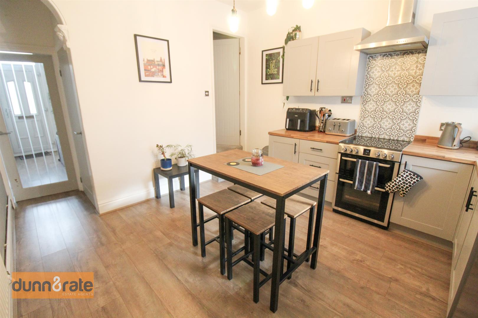 A UPVC window looks out to the rear aspect. Fitted with a range of wall and base storage units and coordinating work surface areas. Stainless steel sink and side drainer, freestanding electric cooker with extractor above and tiled splashback. Space for fridge/freezer and table and chairs. Radiator, door to under-stair storage cupboard.