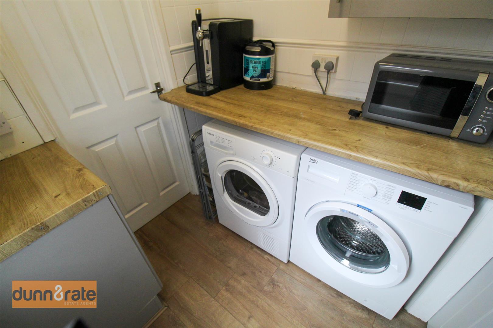 A UPVC door opens to the rear aspect. Storage units with worktop and space and plumbing for a washing machine and a dryer. Combi Boiler.