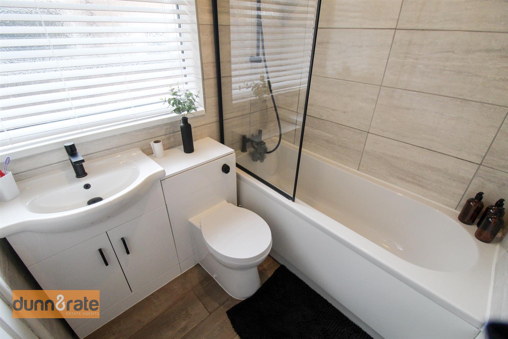 A UPVC window looks out to the side aspect. Fitted suite comprising of bath with shower over head, Low Level WC, wash hand basin and vanity unity. Towel radiator and fully tiled walls.