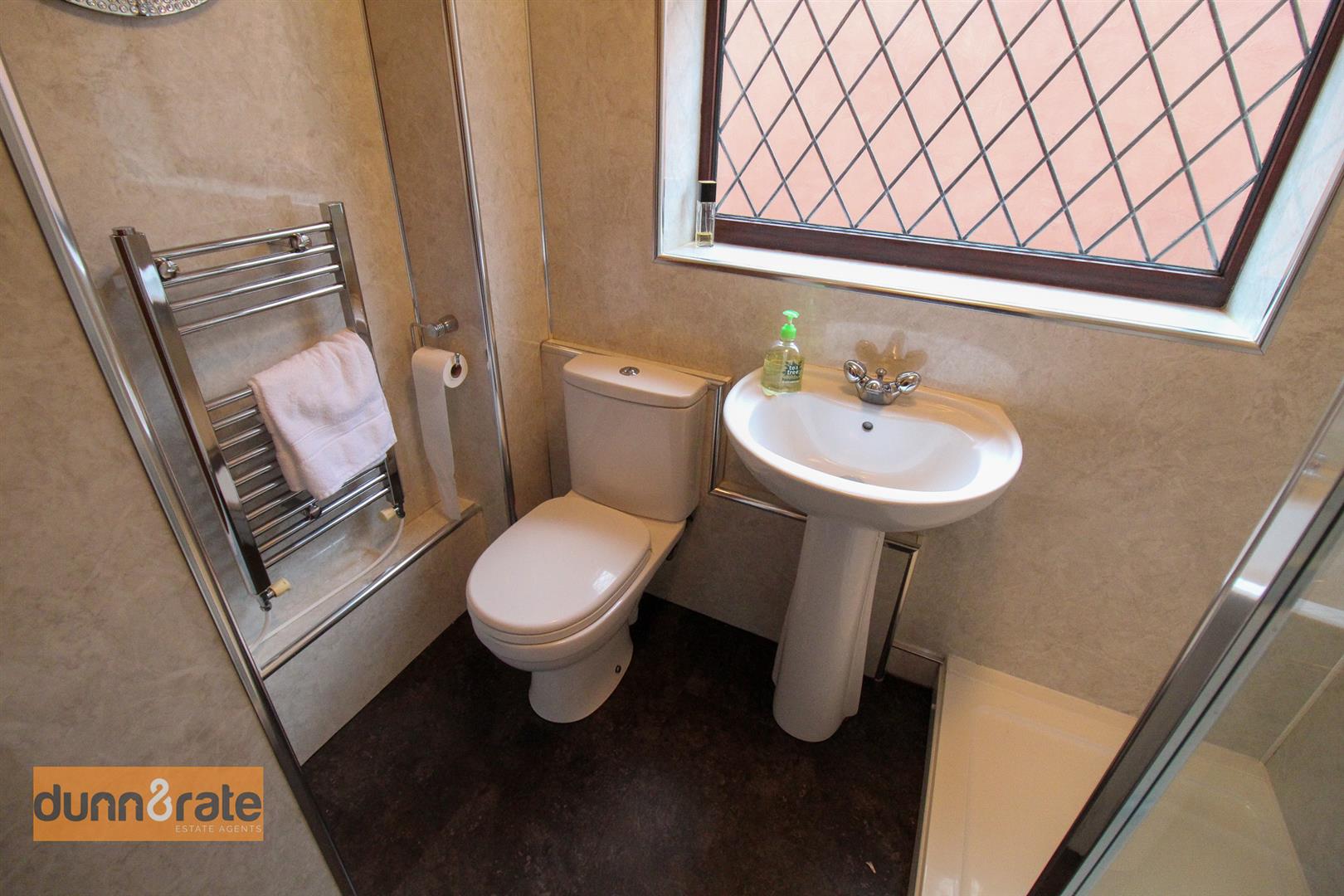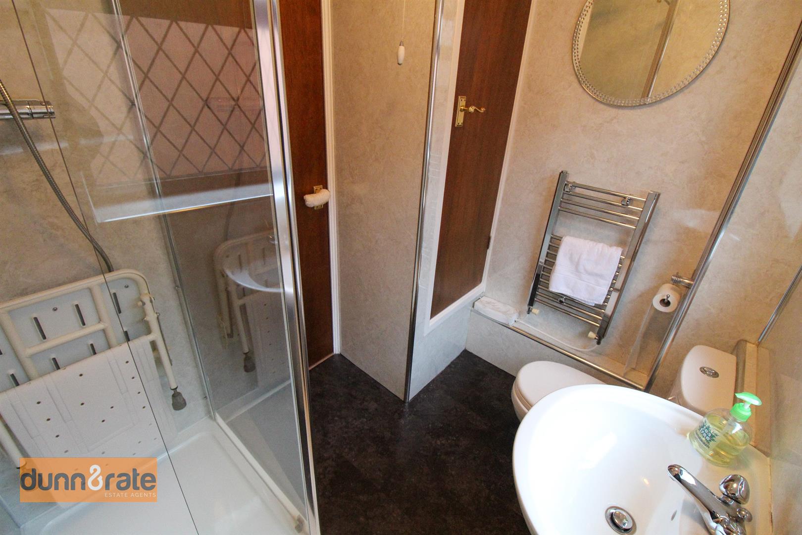 A double glazed window overlooks the side aspect. Fitted with a suite comprising walk in shower unit with waterfall shower head, low level W.C and wash hand basin. Ladder style towel radiator and extractor fan. Airing cupboard housing central heating boiler.
