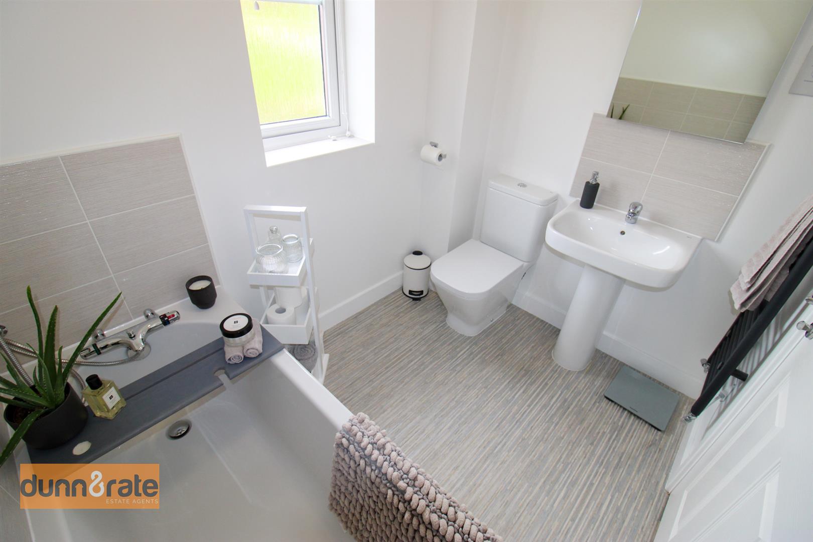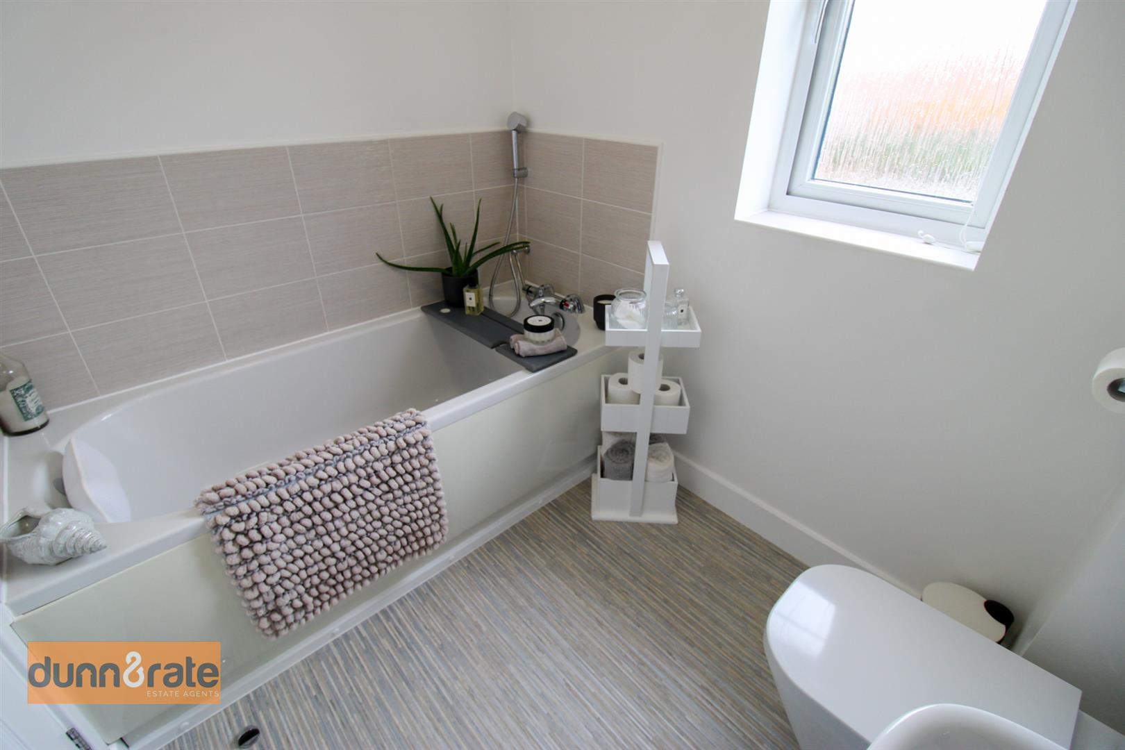 A double glazed window overlooks the side aspect. Fitted with a suite comprising bath with mixer shower tap, low level W.C and wash hand basin. Partly tiled walls, extractor fan, shaver point and ladder style towel radiator.
