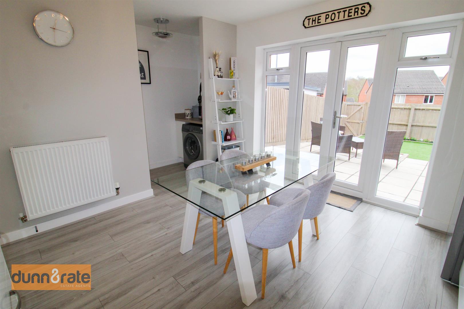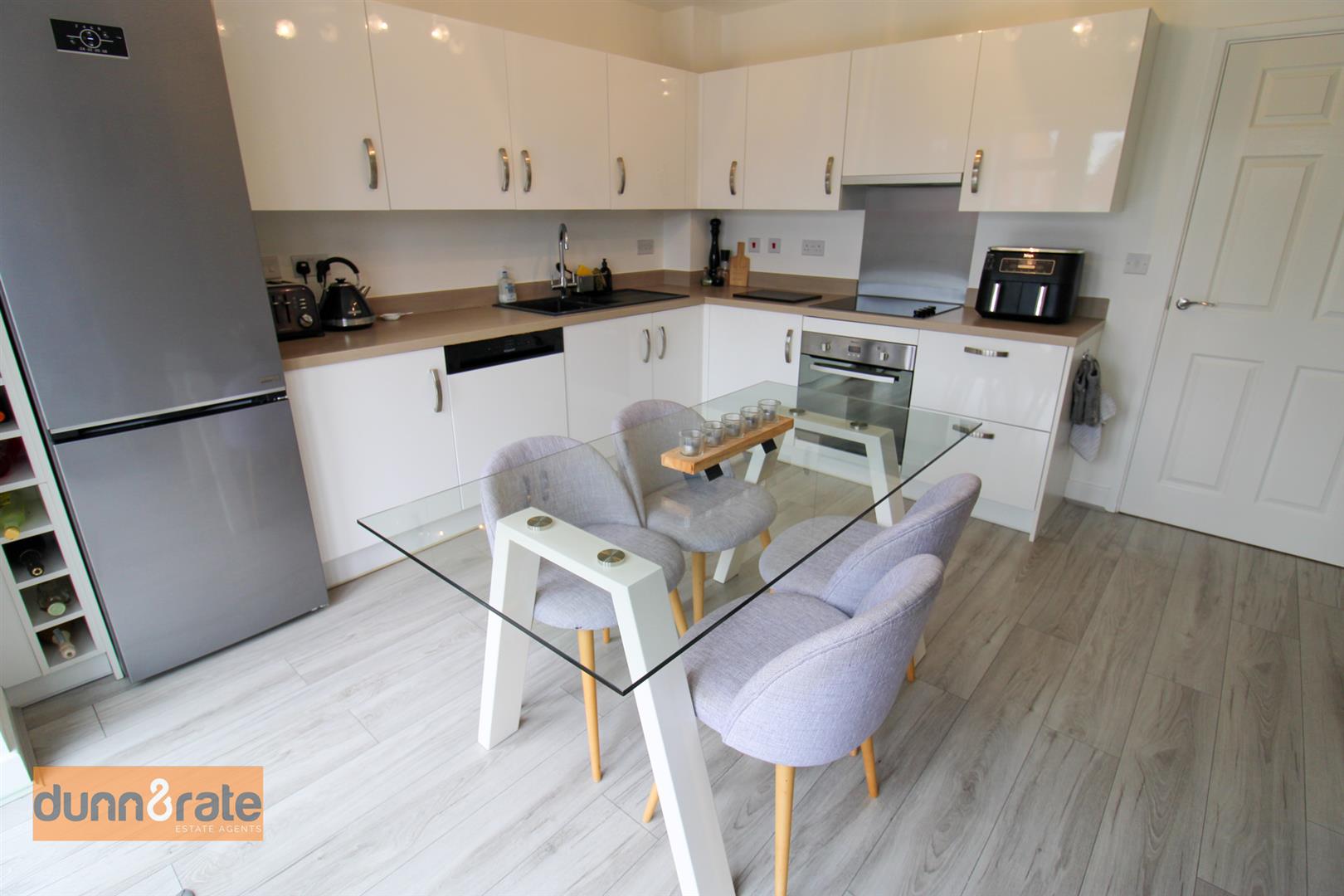 Double glazed patio doors lead out onto the rear garden. Fitted with a range of wall and base storage units with inset asterite sink unit and side drainer. Coordinating work surface areas and integrated electric oven with hob over and cookerhood above. Integrated dishwasher and space for a fridge/freezer. Radiator. Space for table and chairs.