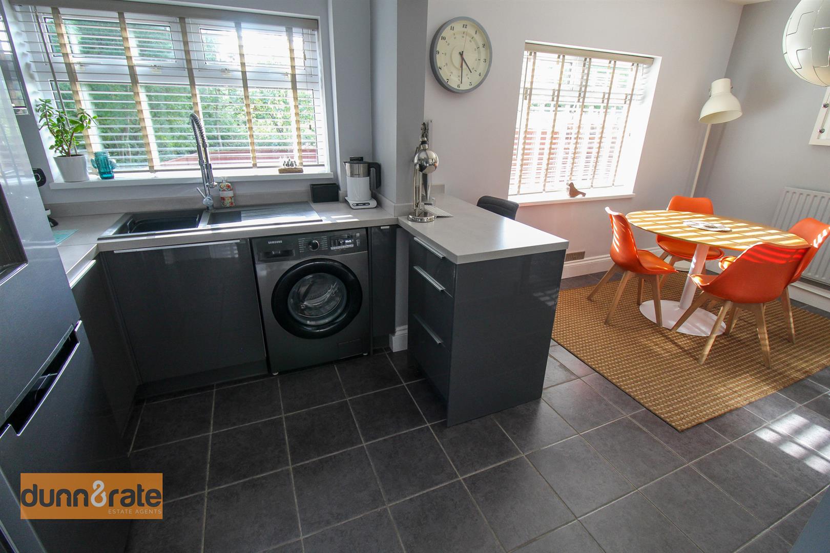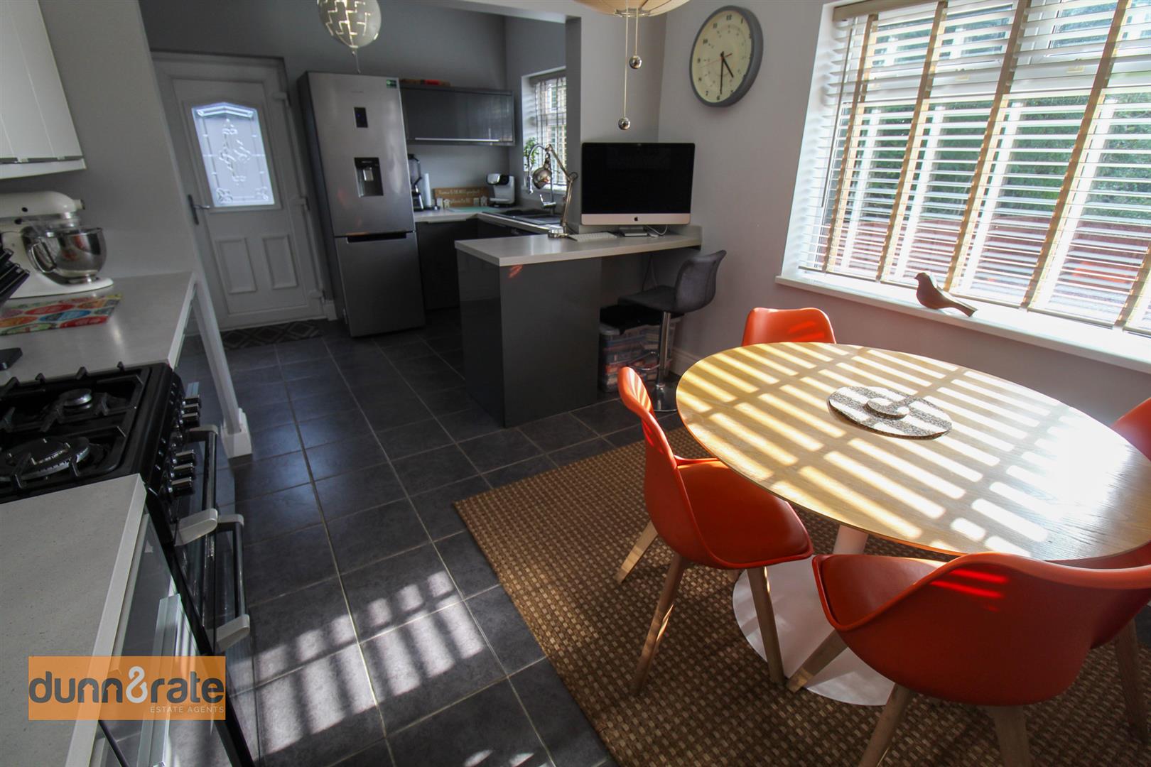 Two UPVC windows look out to the rear aspect and a UPVC door leads out to the side. Fitted with a range of wall and base storage units with coordinating work surface areas and breakfast bar. Appliances include freestanding gas cooker and dishwasher. Space for fridge/freezer and plumbing for a washing machine. Storage cupboard with space for dryer.