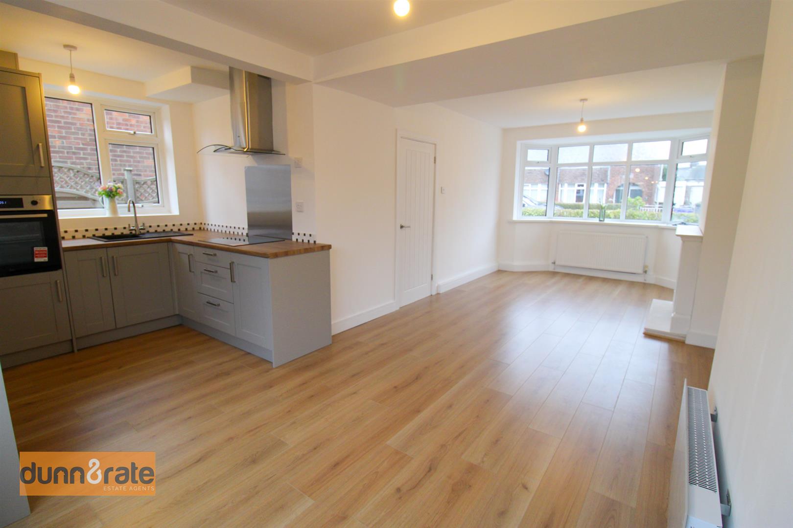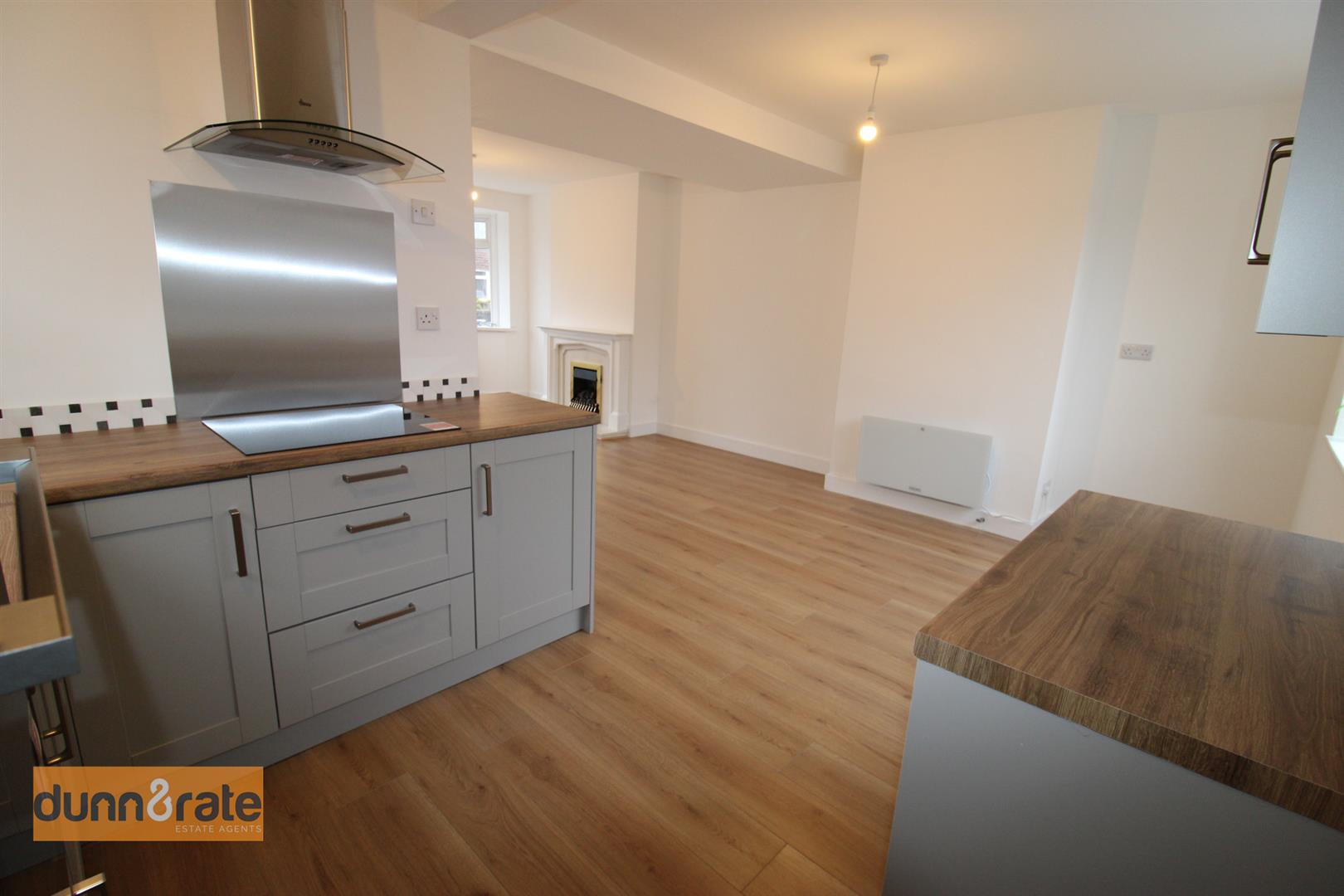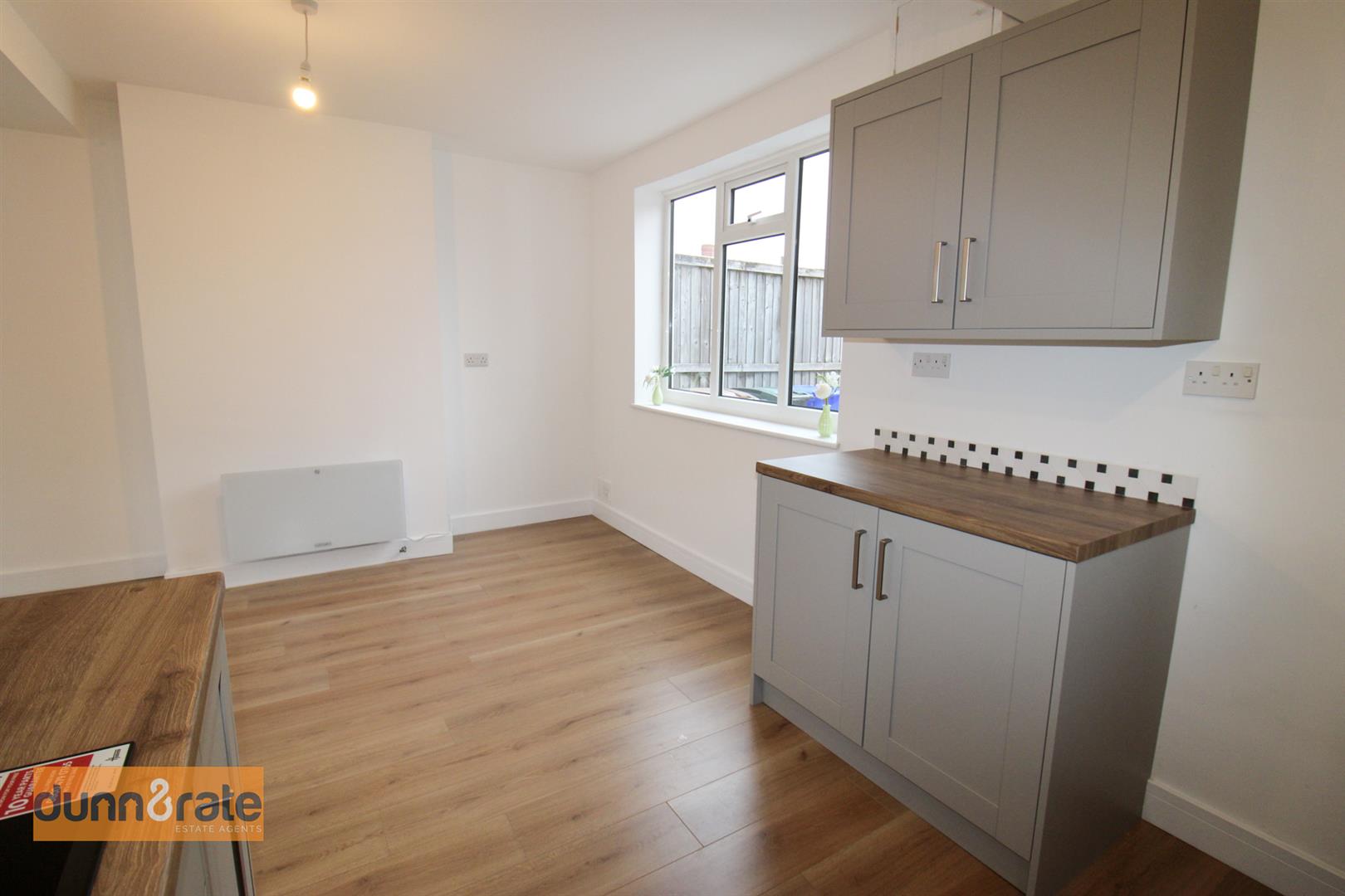 A large open plan L-shaped lounge/dining/kitchen. The lounge/dining area had a double glazed bow window to the front and a double glazed to the rear. Fireplace housing gas fire. Radiator and wall mounted electric heater. The kitchen area has a double glazed window to the side aspect and a access door into the utility room. The kitchen is fitted with a range of wall and base storage units with inset asterite sink unit and side drainer. Coordinating work surface areas and integrated electric oven and induction hob with cooker hood above.