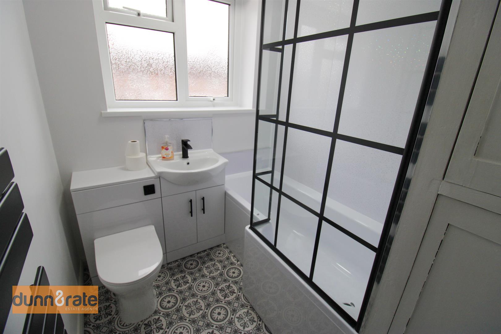 A double glazed window overlooks the rear aspect. Fitted with a suite comprising bath with waterfall shower over, vanity hand wash basin and low level W.C. Airing cupboard housing central heating boiler. Ladder style towel radiator.