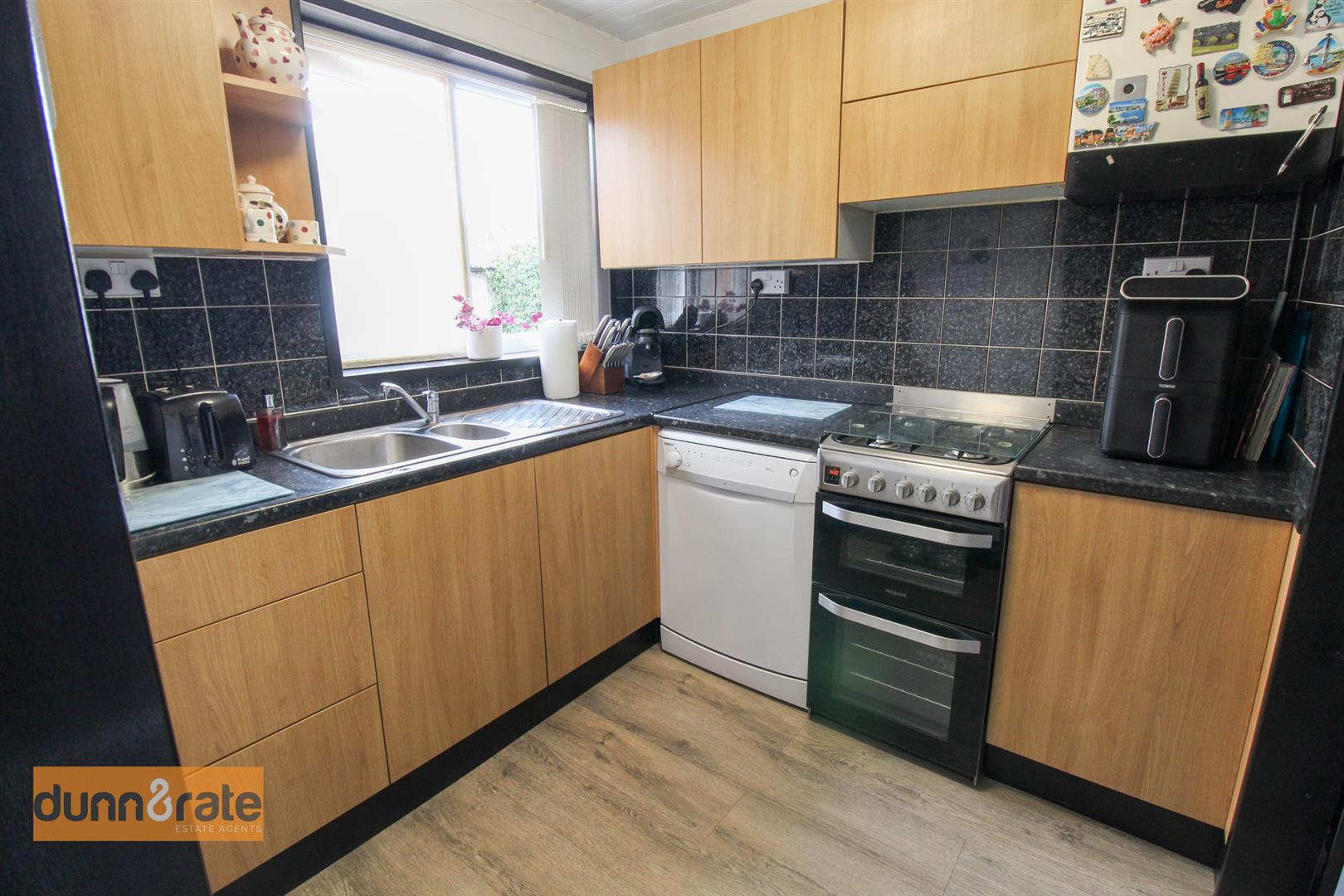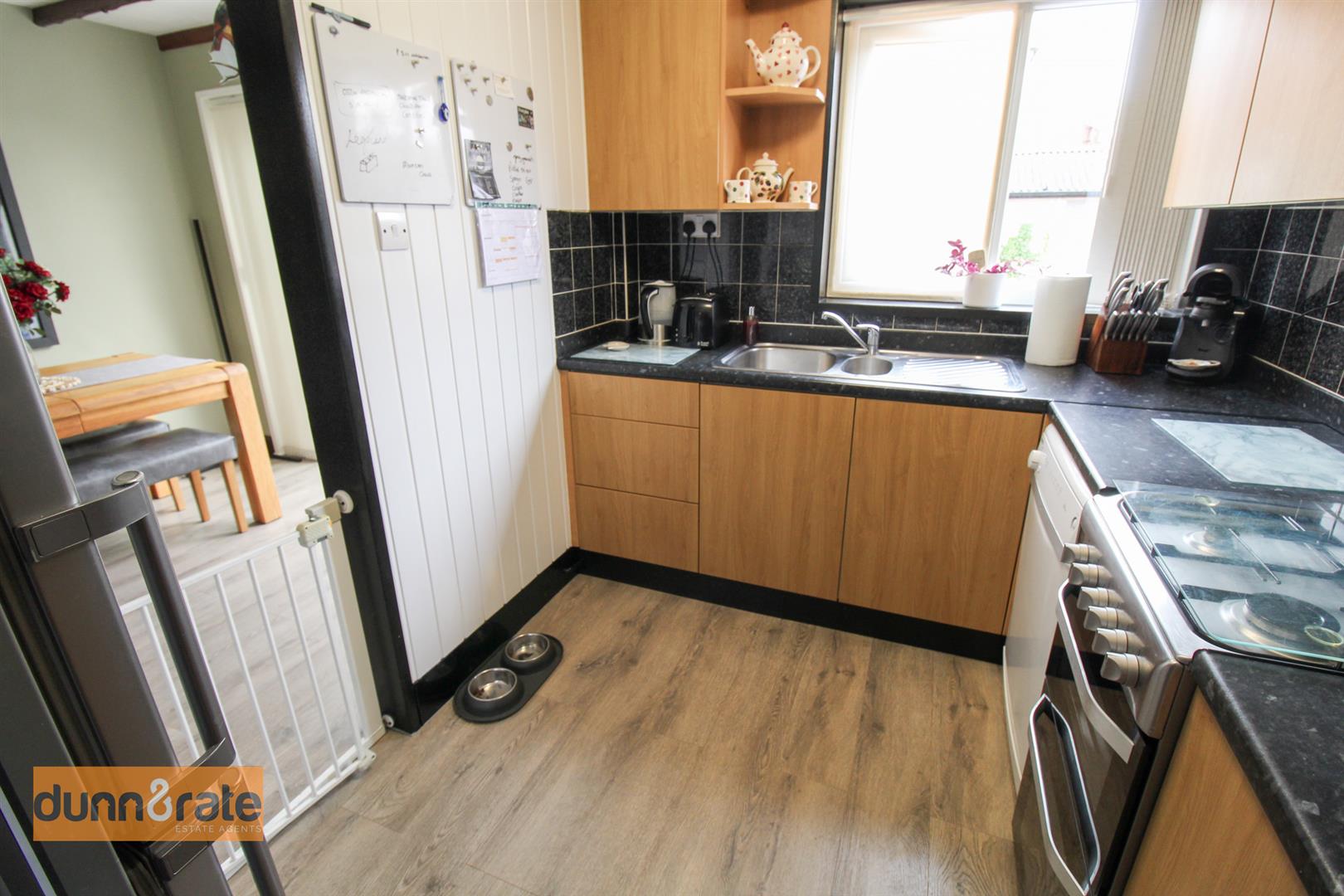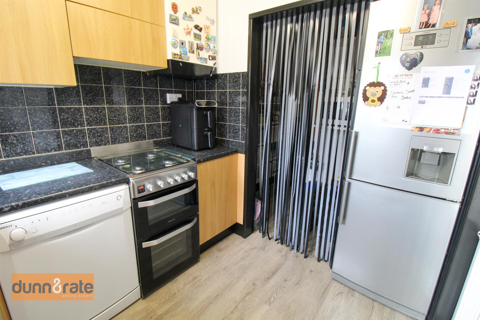 A double glazed window overlooks the rear aspect. Fitted with a range of wall and base storage units with inset stainless steel sink unit and side drainer. Coordinating work surface areas and partly tiled walls. Freestanding gas cooker and space and plumbing for fridge/freezer and dishwasher. Large walk in under stairs storage pantry. Wall mounted central heating boiler.