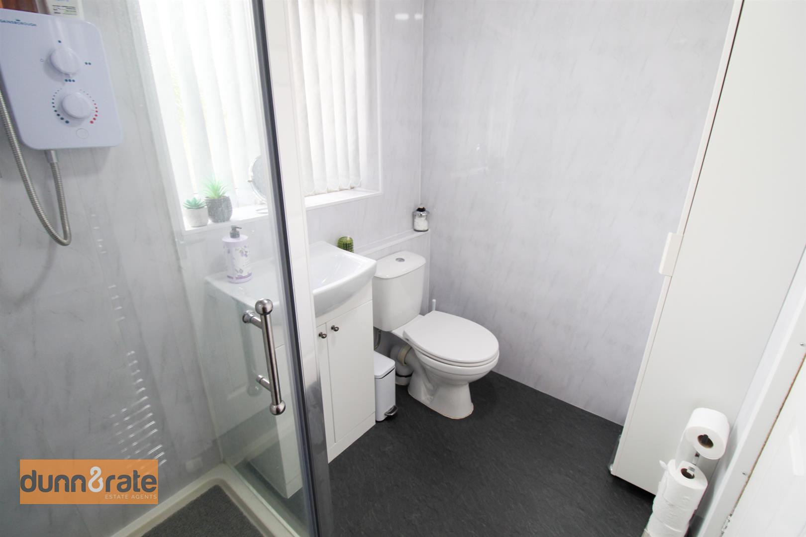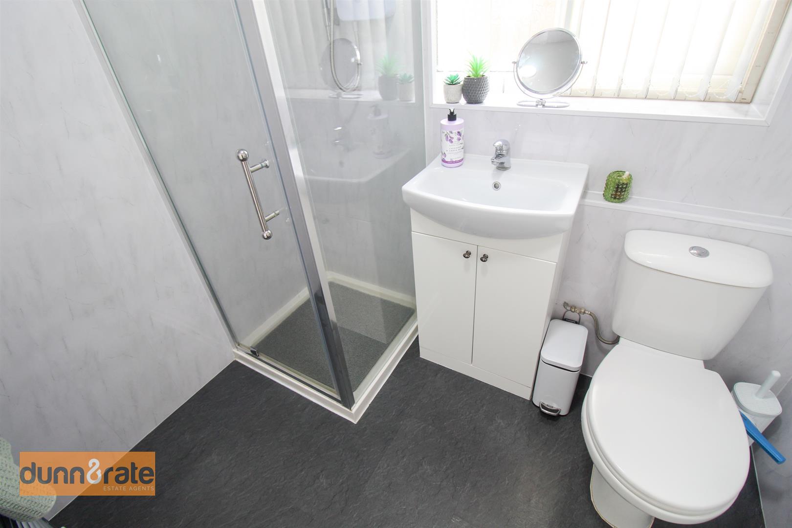 A double glazed window overlooks the rear aspect. Fitted with a suite comprising shower unit, vanity hand wash basin and low level W.C. Ladder style towel radiator.