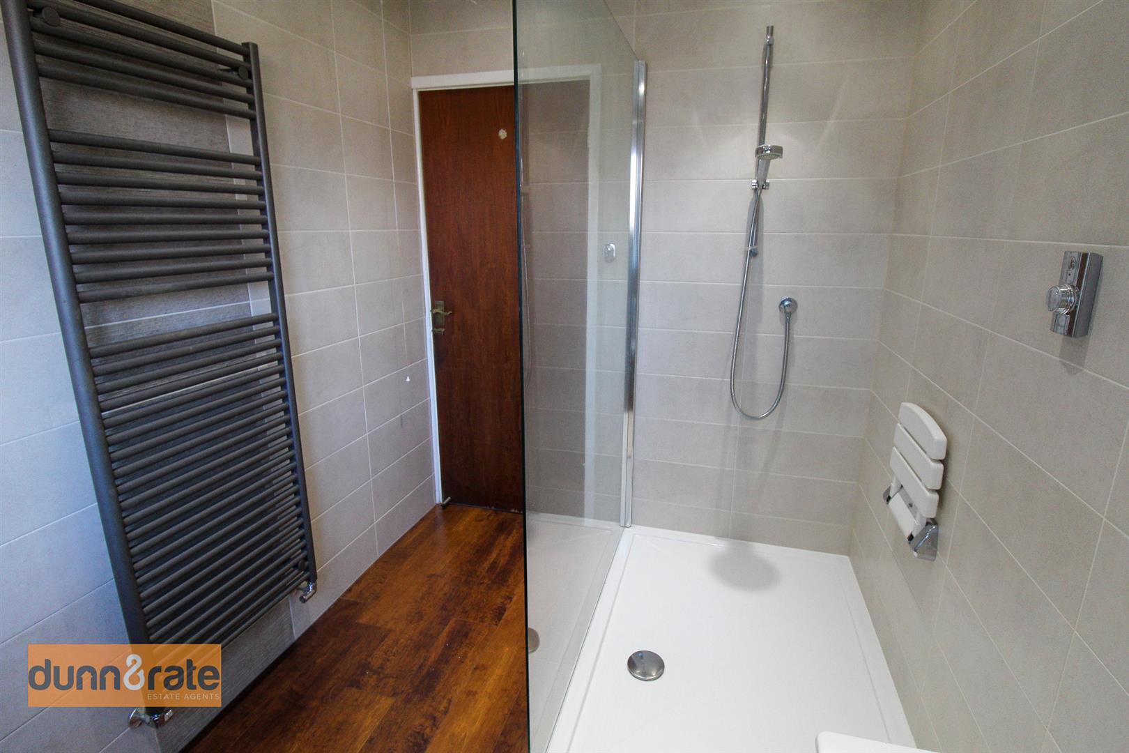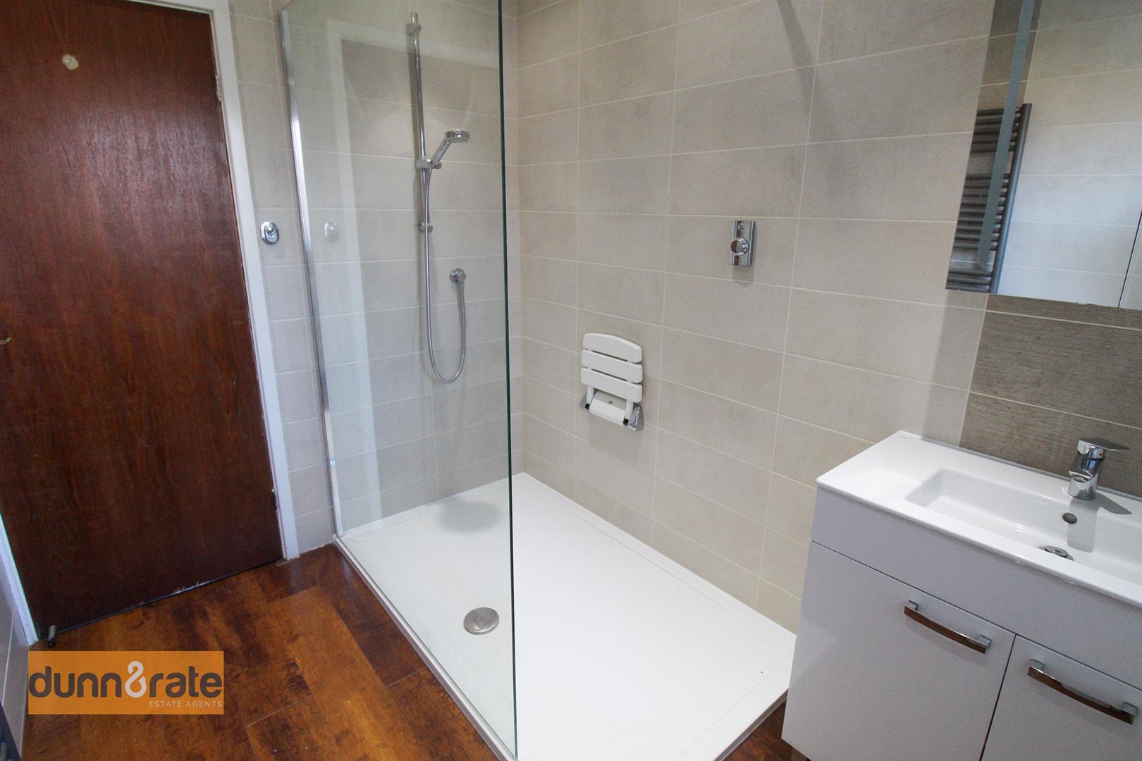UPVC window to the side aspect. Fitted with a suite comprising double shower cubicle with waterfall above, vanity wash hand basin and low level W/C. Fully tiled walls and vertical towel rail. Ceiling spotlights.