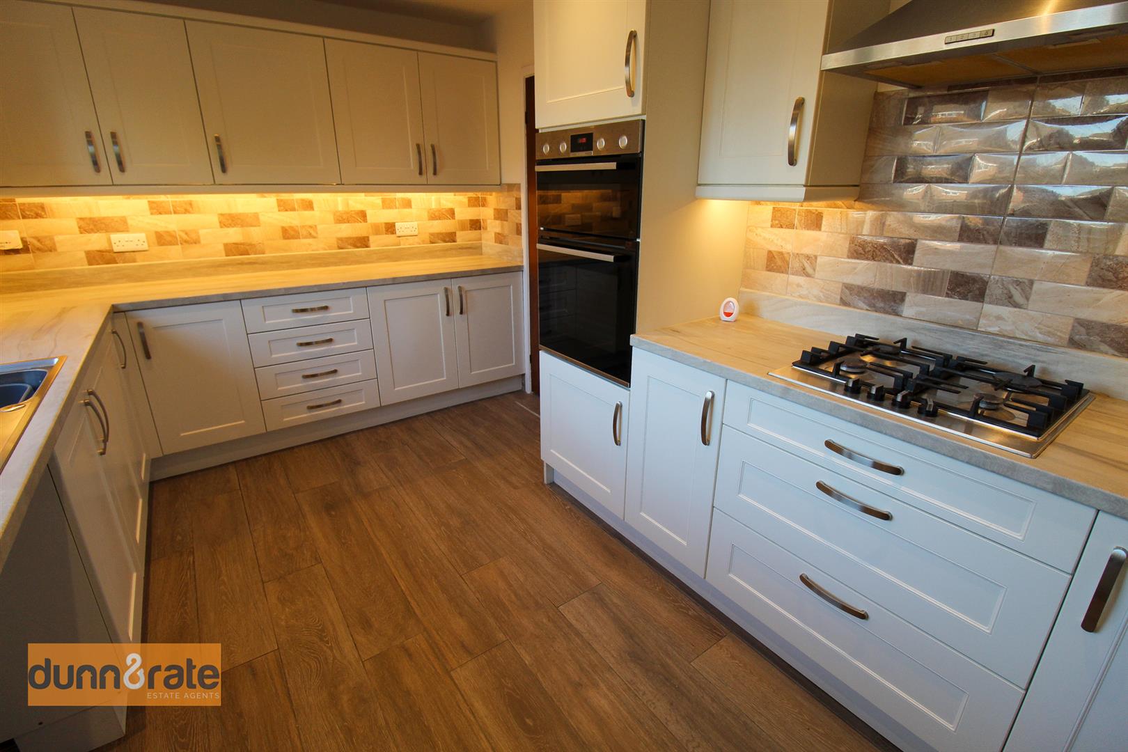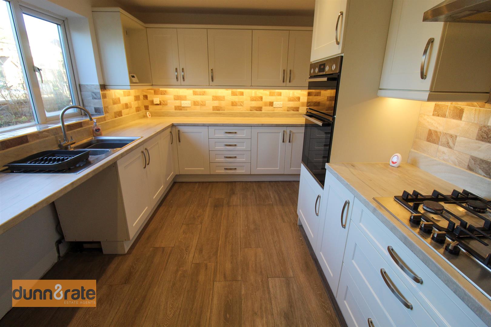 Composite stable door to the rear aspect and UPVC window to the side aspect. Fitted with a range of wall and base storage units with inset stainless steel sink and side drainer. Co ordinating work surface areas and partly tiled walls. Integrated appliances include electric oven and gas hob with cooker hood above. Fridge. Plumbing for a washing machine and space for tumble dryer. Ceiling spotlights and tiled flooring.