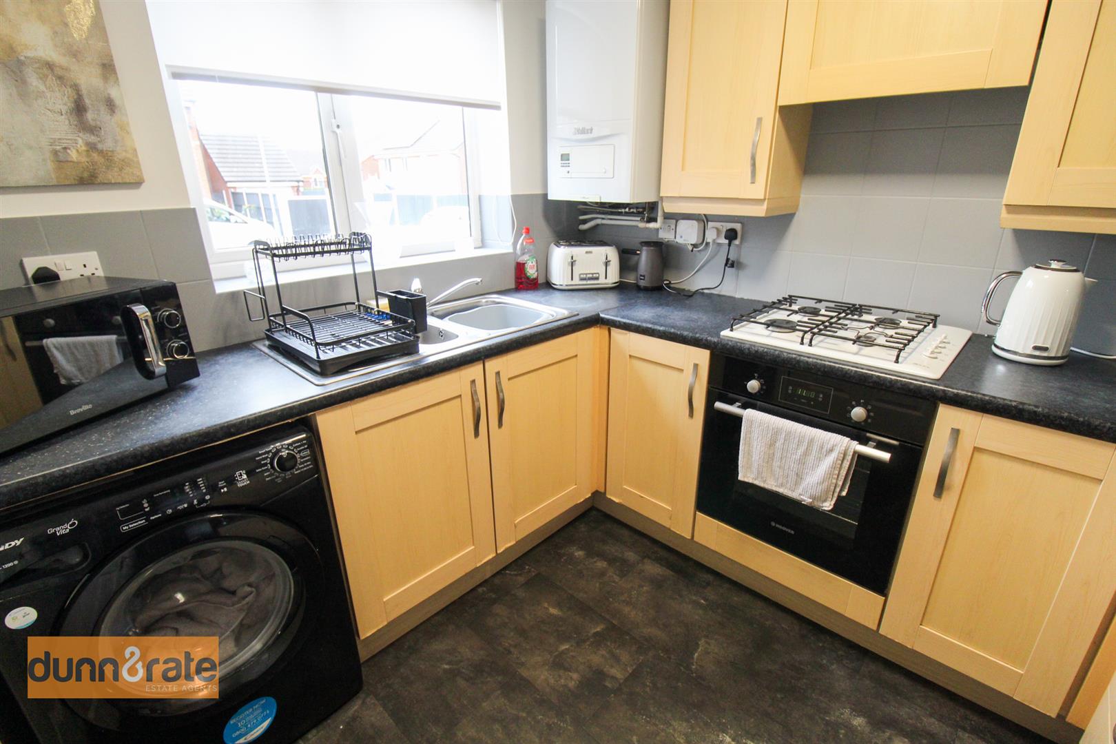 A UPVC window looks out to the front aspect. Fitted with a range of wall and base storage units, inset stainless steel sink/drainer and coordinating work surface areas. Electric oven with gas hob and extractor fan above, space and plumbing for a washing machine and space for a fridge/freezer. Partly tiled walls, combi boiler and radiator.