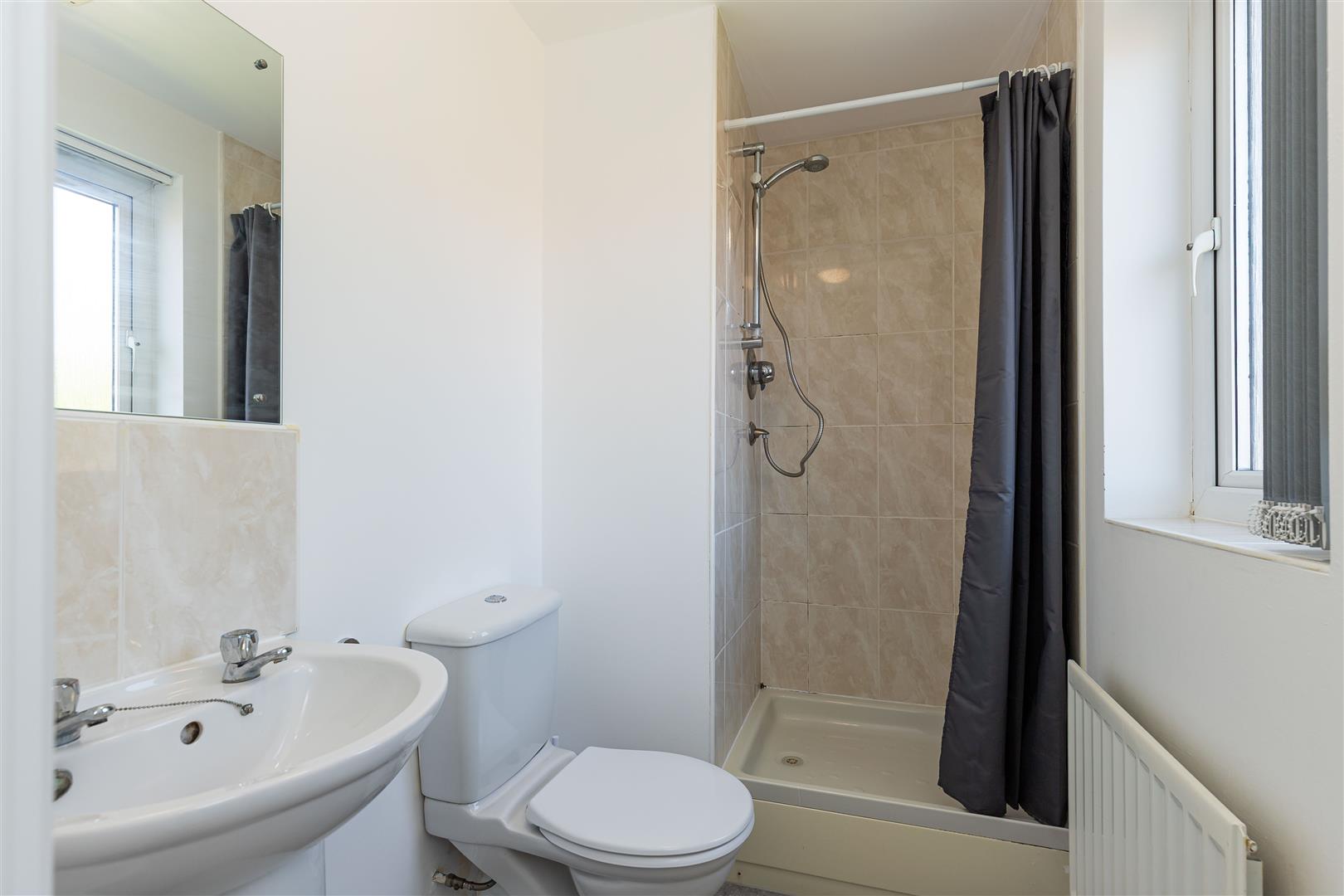 Includes a bath with electric shower, wash basin, and toilet.