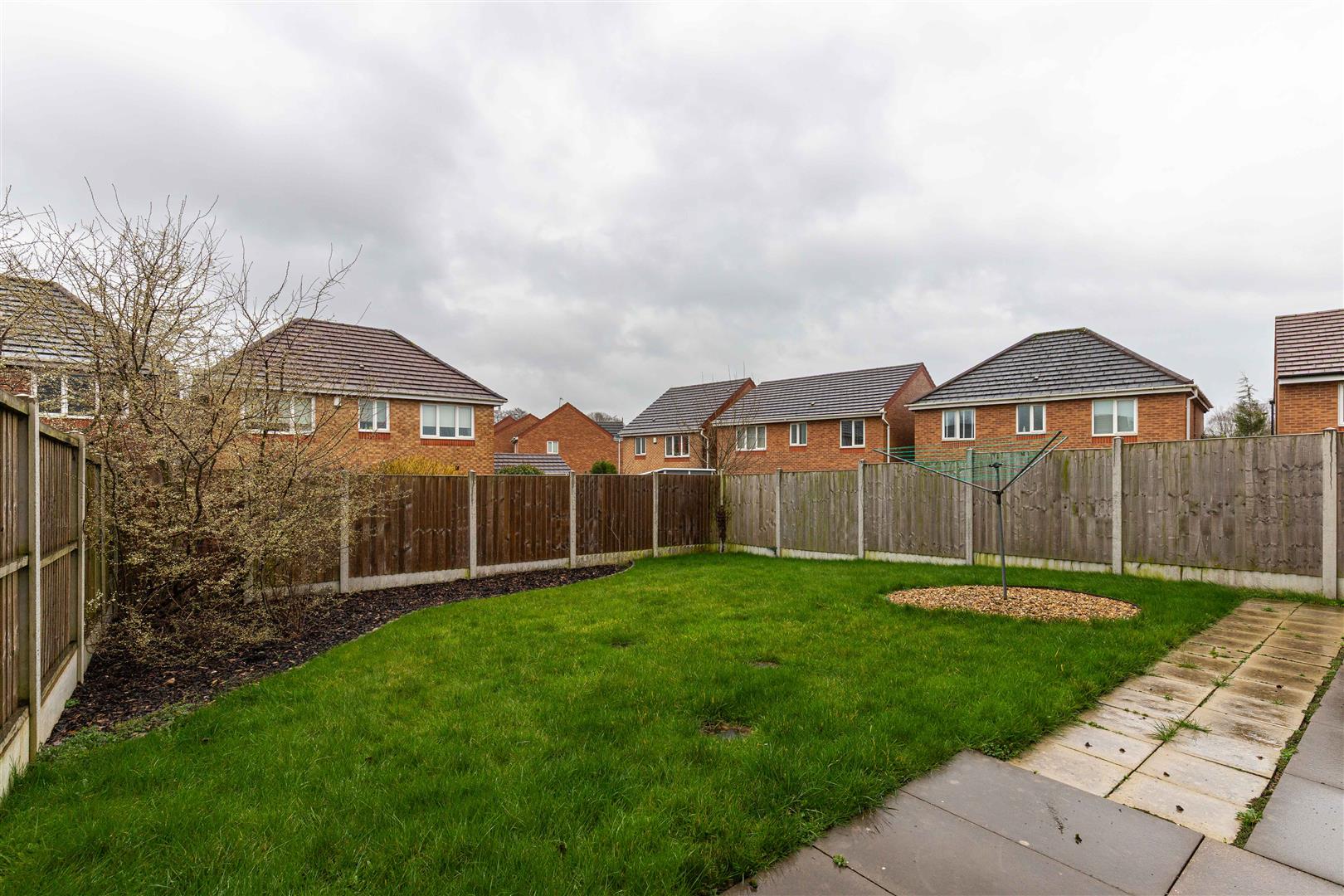 A fully enclosed, and safe, garden that primarily consists of a large lawn space, a patio next to the property, and a mature flowerbed.