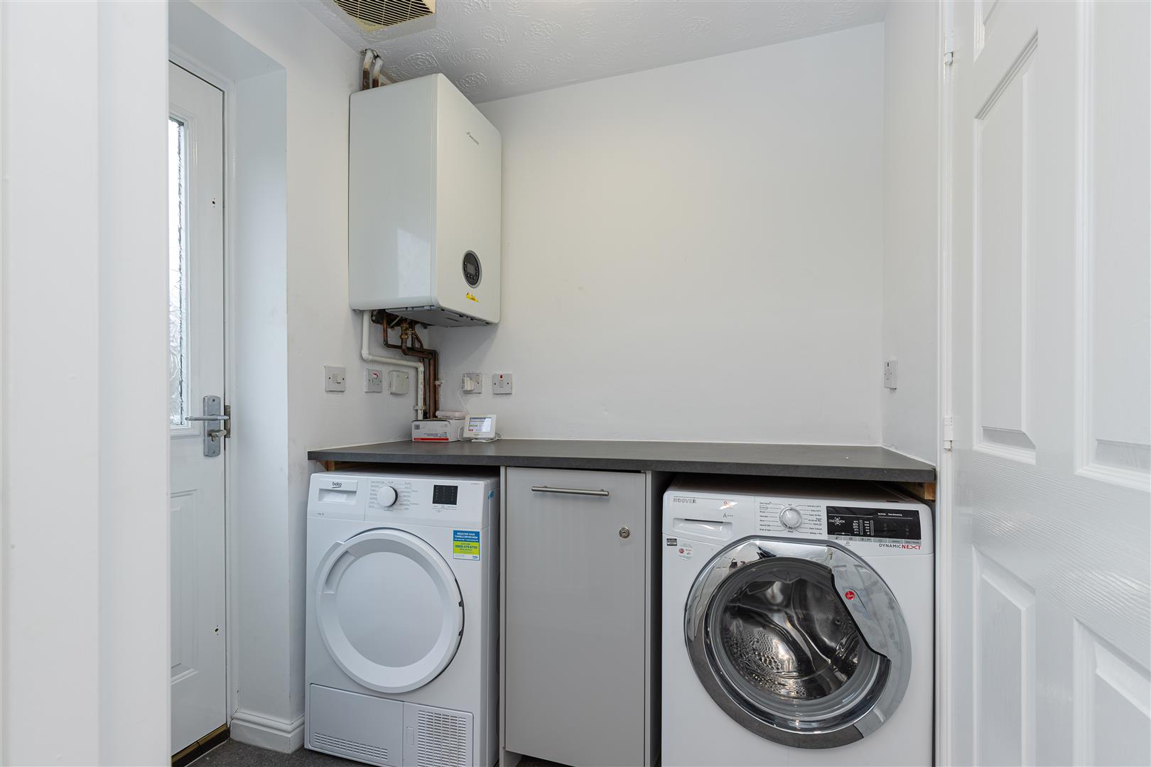 A handy space with extra worktop, and storage, space. As well as spaces, and associated plumbing, for your washing machine and drying.