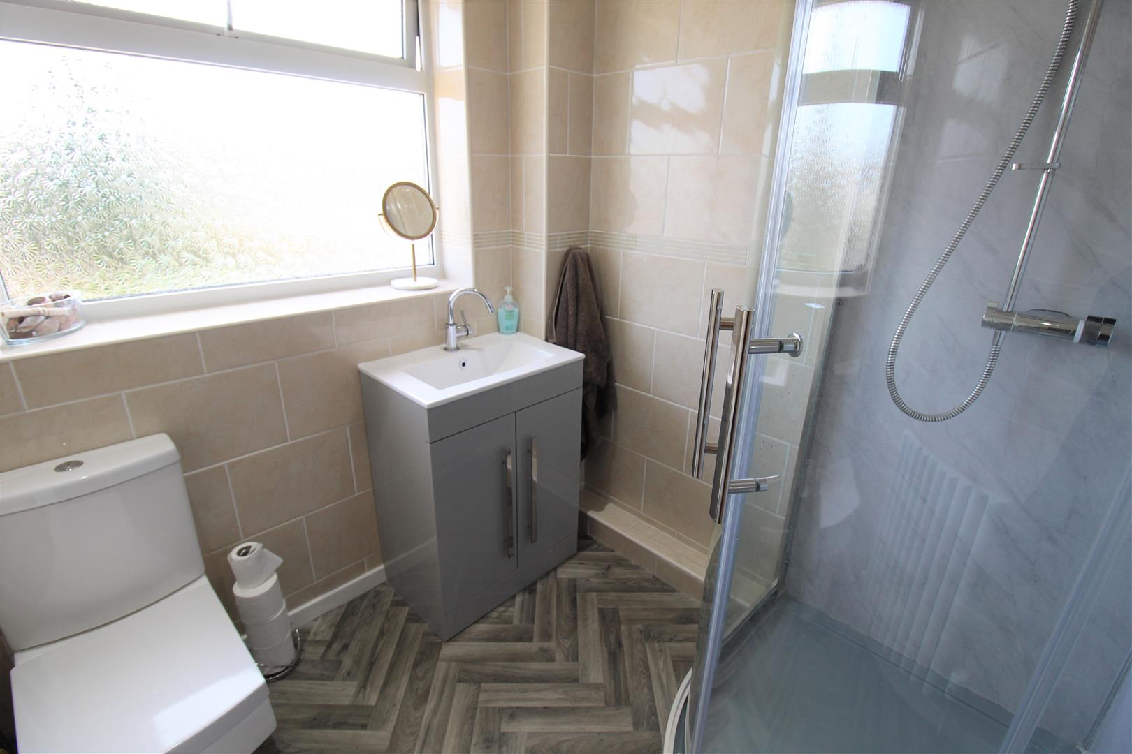 A UPVC window to the rear aspect. Fitted with a suite comprising shower cubicle with waterfall above, vanity wash hand basin and low level W.C. Fully tiled walls and extractor fan. Radiator.