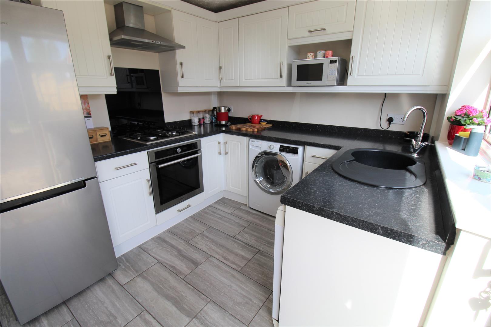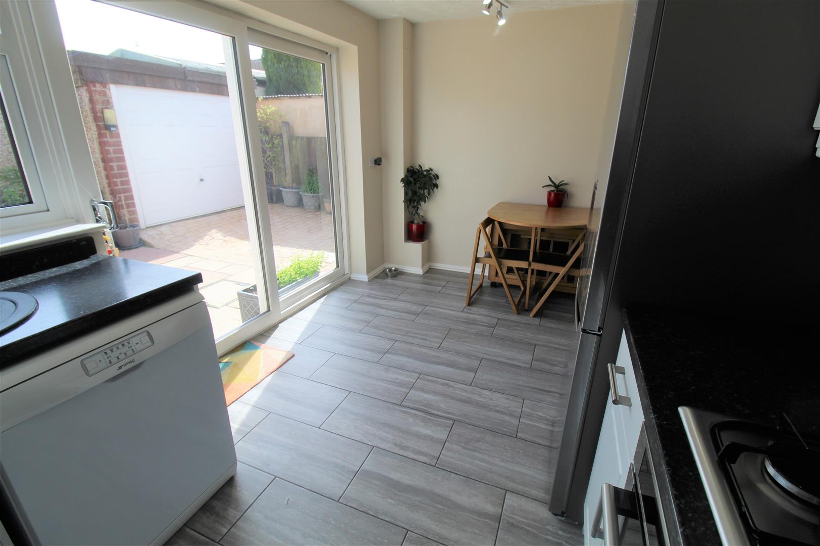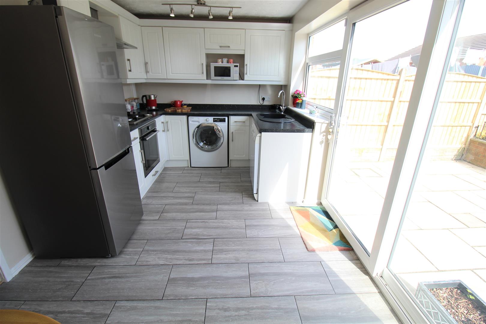 A UPVC window to the rear aspect and UPVC sliding doors to the rear aspect. Fitted with a range of wall and base storage units with inset a sterite sink and drainer. Co ordinating work surface areas and integrated appliances include electric oven and gas hob with cooker hood above. Plumbing for a washing machine and dish washer. Space for a fridge/freezer and radiator. Tiled flooring.
