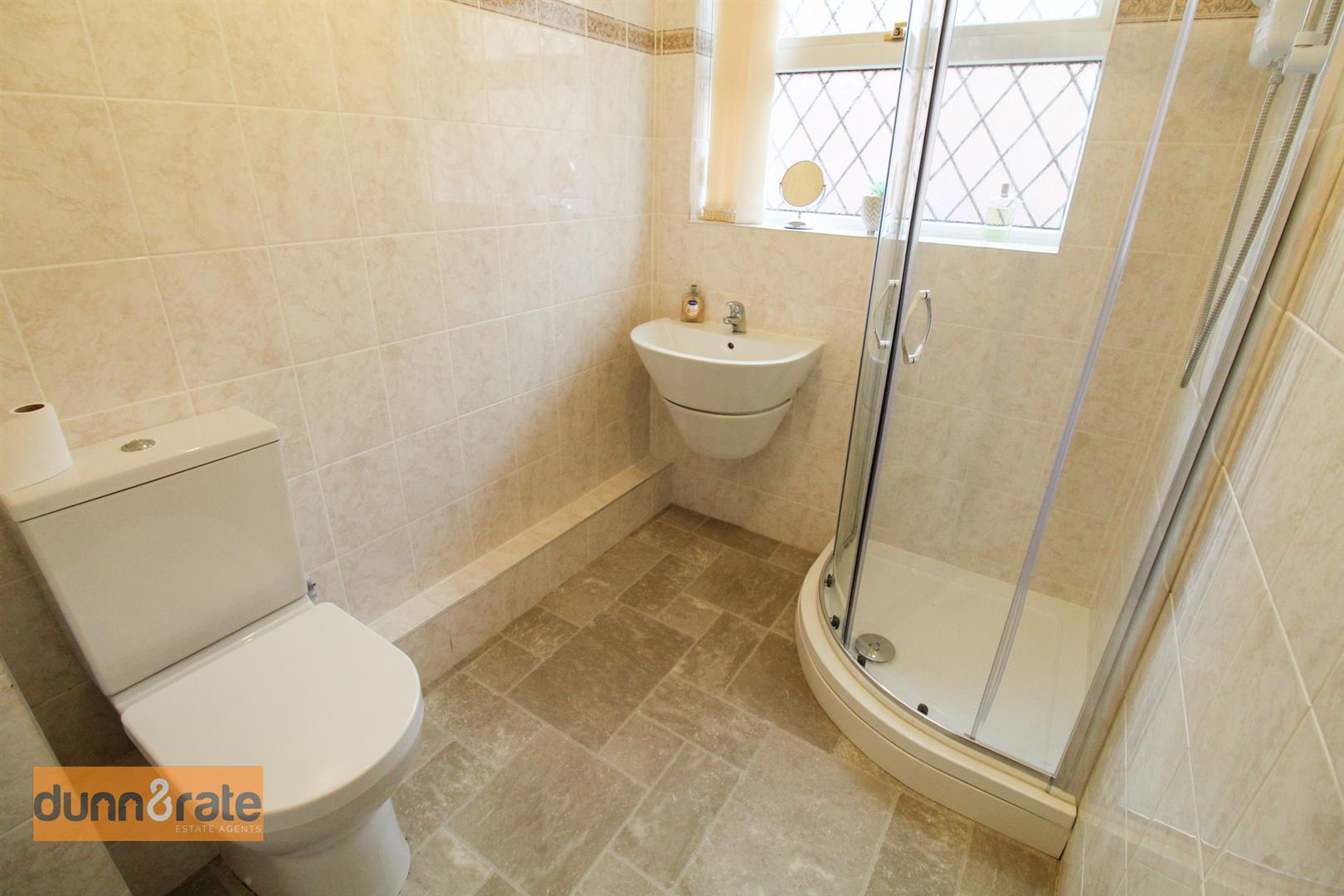 A double glazed window overlooks the side aspect. Fitted with a suite comprising shower unit, low level W.C and wash hand basin. Ladder style towel radiator and fully tiled walls.