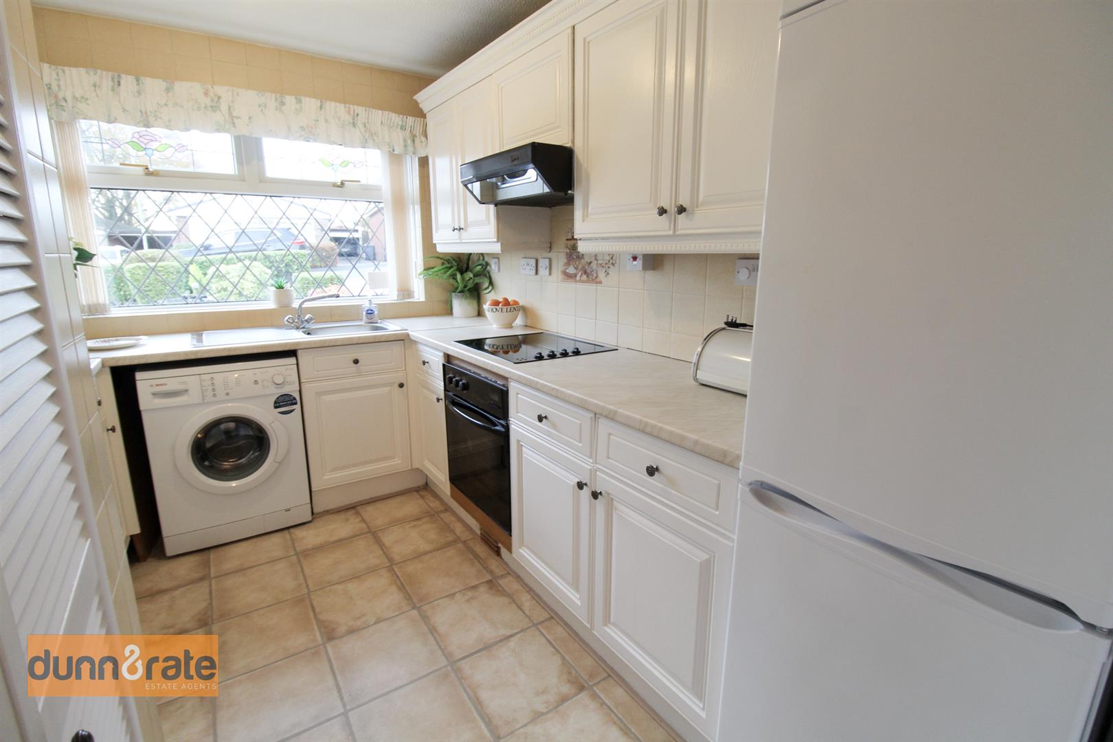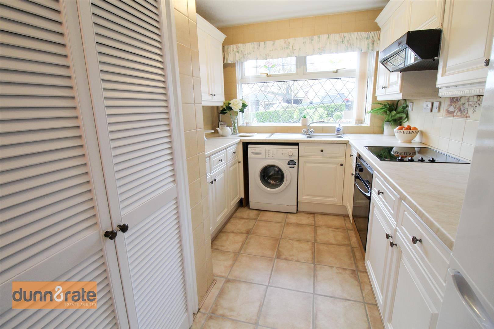 A double glazed window overlooks the front aspect. Fitted with a range of wall and base storage units with inset stainless steel sink unit and side drainer. Coordinating work surface areas and fully tiled walls. Integrated electric oven and hob with cooker hood above. Space and plumbing for fridge/freezer and washing machine. Large storage cupboard housing central heating boiler.