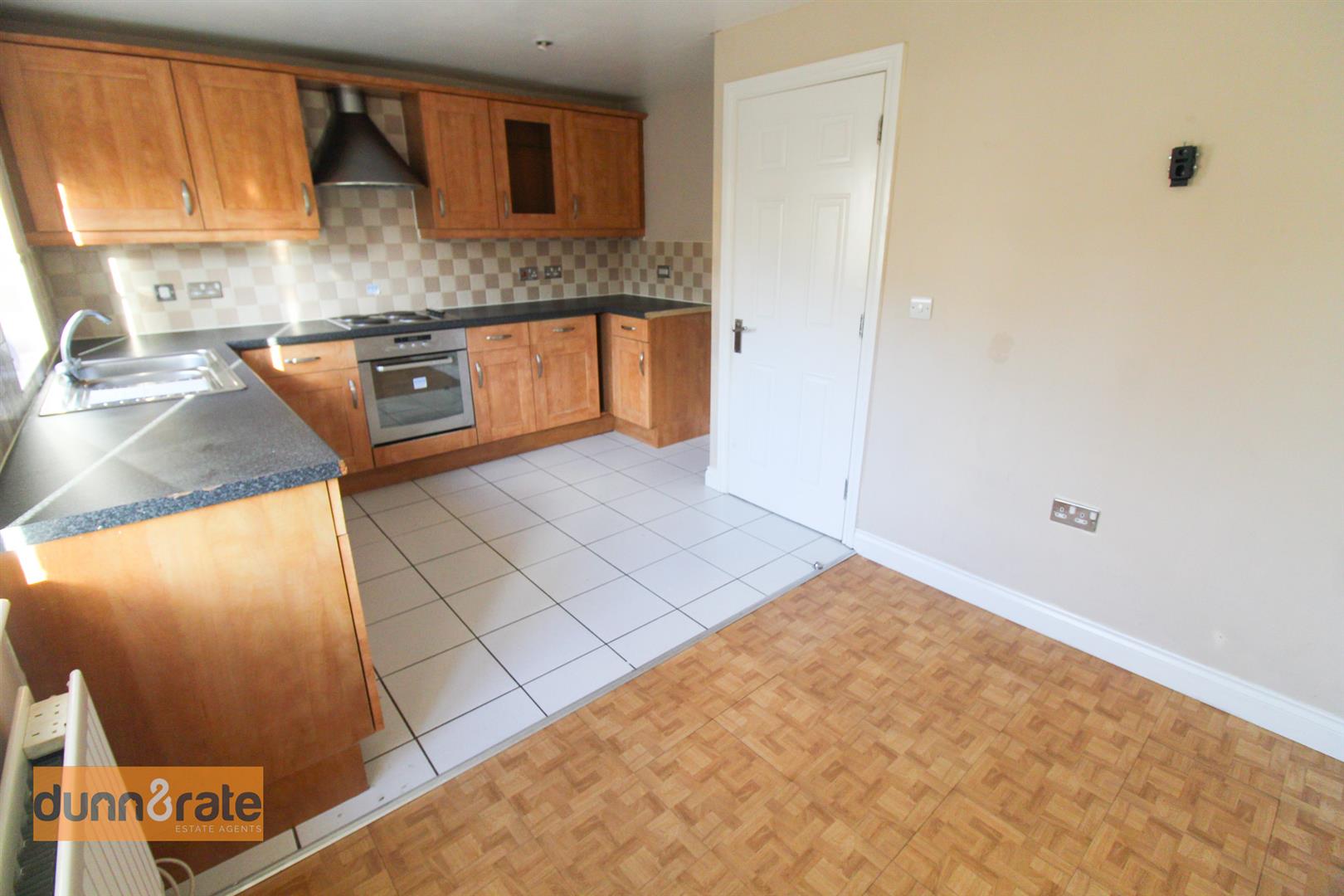 Two double glazed windows overlook the rear aspect. Fitted with a range of wall and base storage units with inset stainless steel sink unit. Coordinating work surface areas and partly tiled walls. Integrated electric oven with hob. Space for fridge/freezer. Ceiling spotlights and space for table and chairs. Radiator.