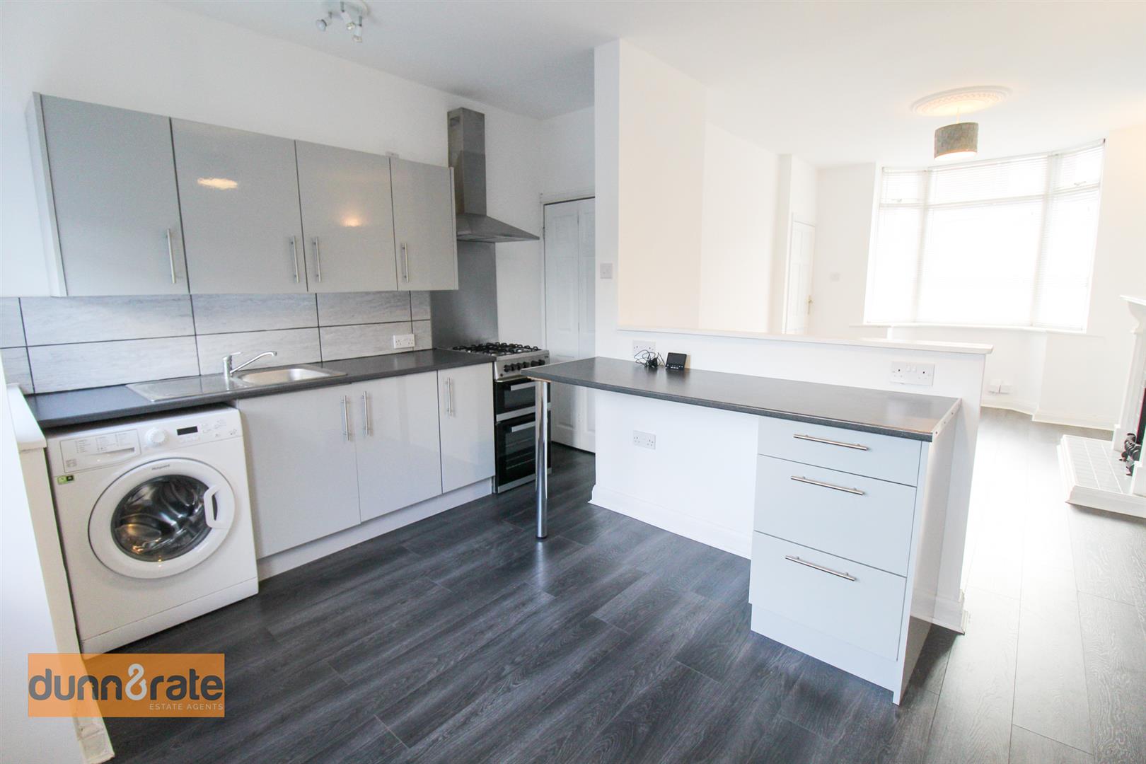 Open plan Kitchen/lounge/diner. A UPVC bay window looks out to the front aspect and decorative fireplace. The kitchen is situated at the rear, with two UPVC windows that overlook the rear aspect, and a door opening to the rear yard. The kitchen is fitted with a range of wall and base storage units, inset stainless steel sink and drainer and coordinating work surface areas with partly tiled walls. Breakfast bar. Washing machine and free standing cooker. Space for a fridge/freezer. Boiler and under-stair storage.