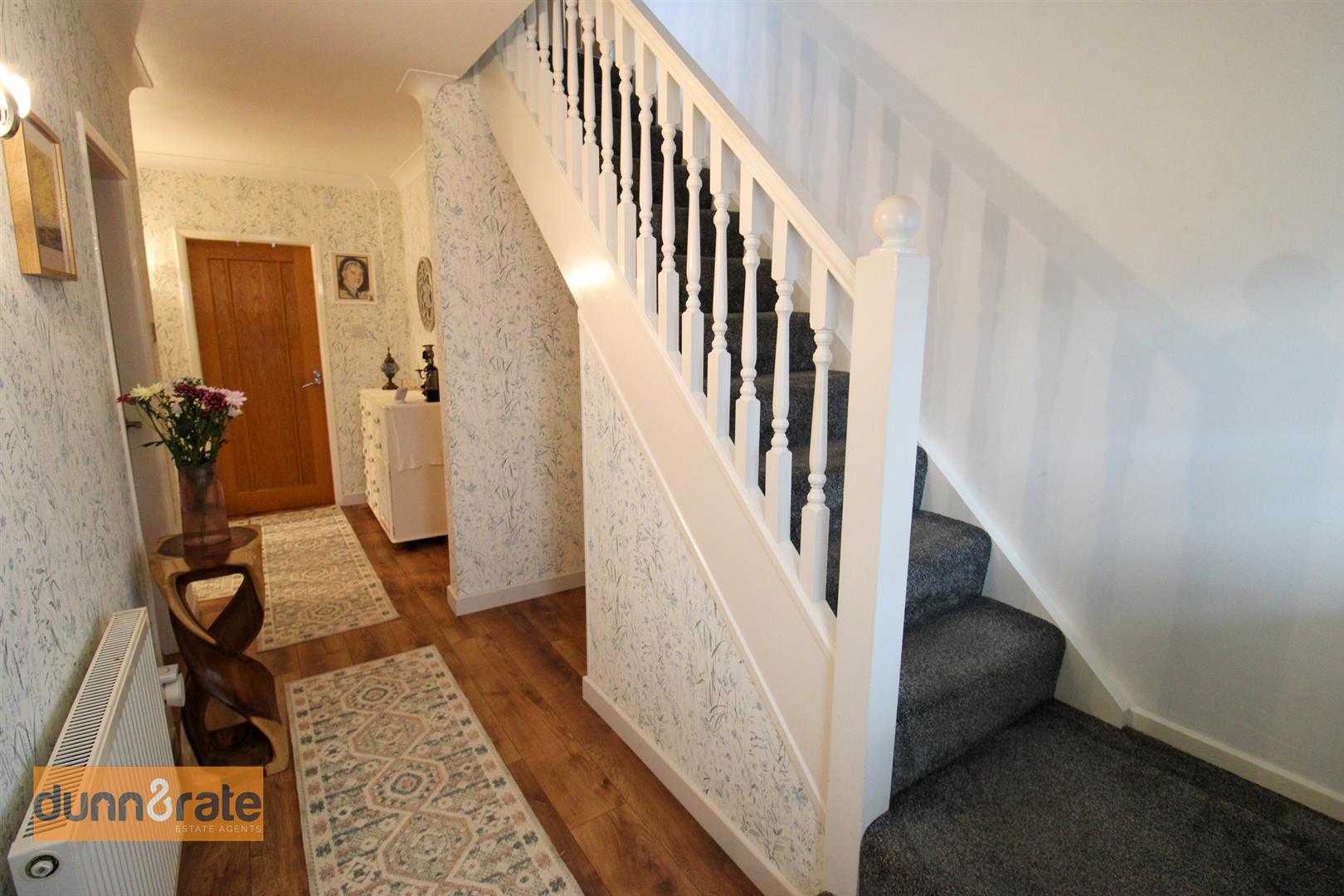 A window looks into the entrance porch. Door to under stair storage. Radiator.
