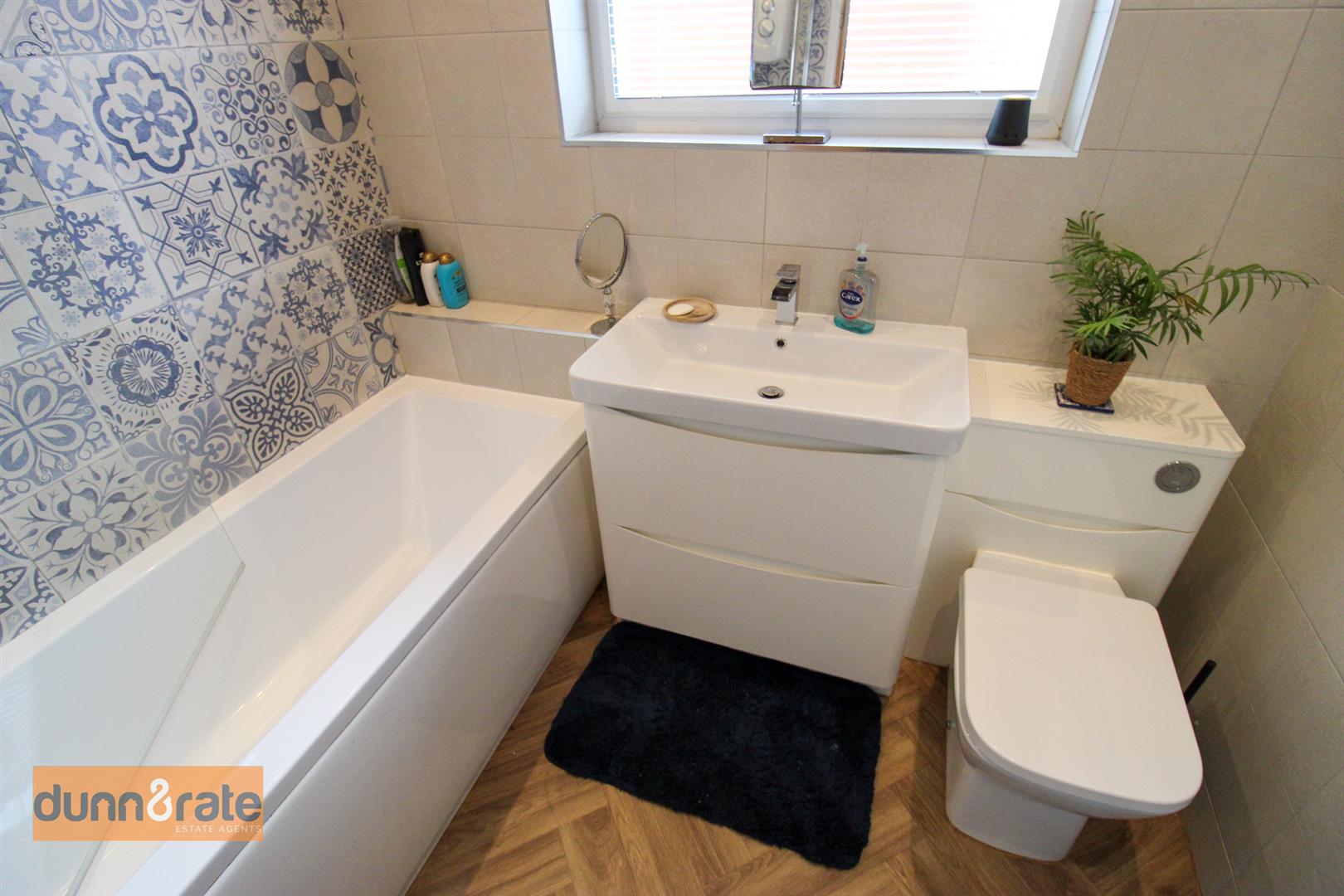 A double glazed window looks out to the side aspect. Fitted suite comprising of bath with shower overhead, wash hand basin and vanity drawer and Low Level WC. Fully tiled walls, towel radiator and spot lights.