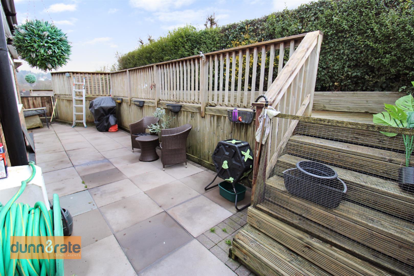 To the front of the property there is a sweeping paved path leading to the front door. A paved patio area, and sleeper borders with decorative stone. Off road parking for two cars. There is access to the rear garden via the side access gate. The rear garden has a lower paved patio area and a raised decking patio area. Storage shed.
