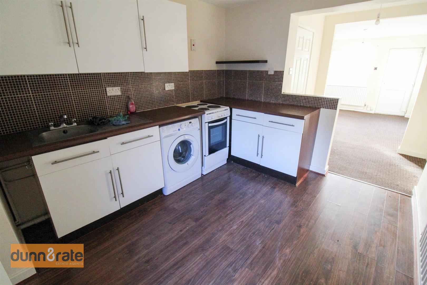 A UPVC door opens into the lounge/diner, with a window to the front aspect and stairs to the first floor. Electric fire, radiator and a door to under-stair storage. The kitchen is fitted with a range of wall and base storage units, coordinating worksurface areas and inset stainless steel sink and drainer. Space for a fridge/freezer and washing machine. Radiator,