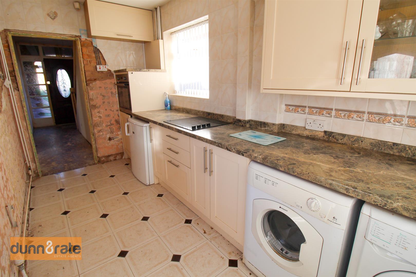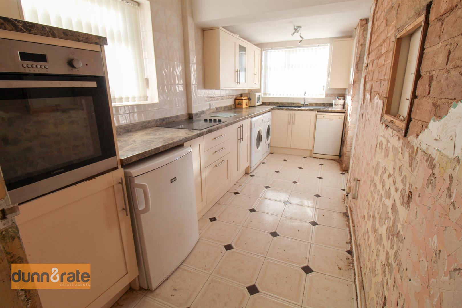 A double glazed window overlooks the side and rear aspect, coupled with a UPVC door to the side aspect. Fitted with a range of wall and base storage units with inset asterite sink unit and side drainer. Work surface areas with space and plumbing for washing machine, dishwasher, fridge/freezer.
