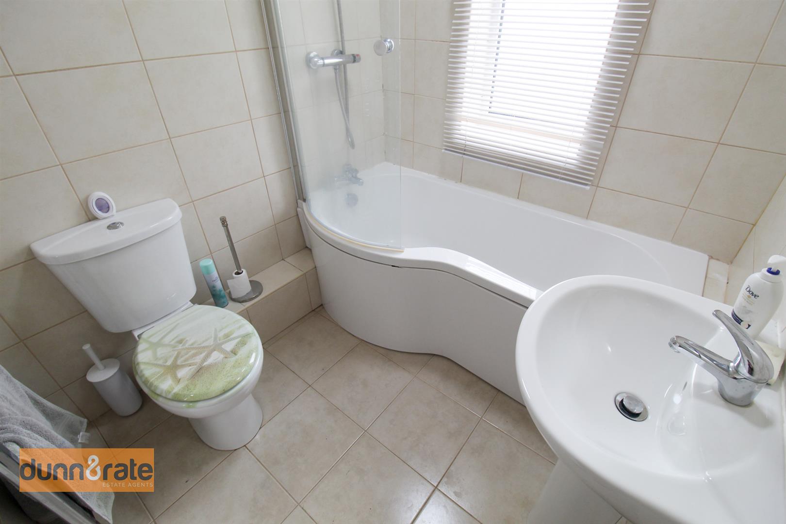 A double glazed window overlooks the rear aspect. Fitted with a suite comprising bath with shower over, low level W.C and wash hand basin. Fully tiled walls and loft access hatch. Ladder style towel radiator.